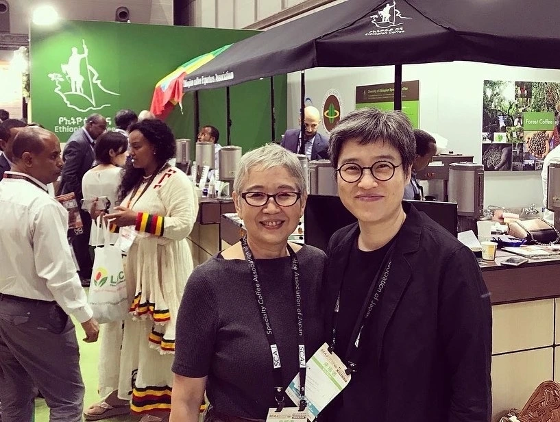 세번째 사진은 2019년 가을 쿠루미 씨와 일본에서 제일 큰 국제규모의 커피행사인 SCAJ(World Specialty Coffee Conference and Exhibition)에서 에티오피아 국가관을 지원할 때 모습입니다. 쿠루미 씨는 방문객들한테 에티오피아 커피 세리머니를 에티오피아인과 함께 소개하는 일을 하셨고 저는 에티오피아 국가관 부스 안에서 커핑(Cupping)하는 일을 지원했습니다.