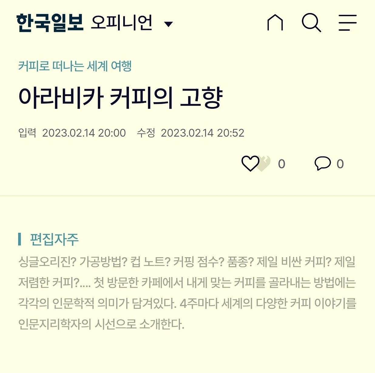 매달 1회 한국일보 오피니언 칼럼에 ‘커피로 떠나는 세계 여행’이라는 주제로 기사를 연재한다. 오늘 첫번째 기사가 나가는 날인데 ‘아라비카 커피의 고향’ 에티오피아에 대해 소개했다.