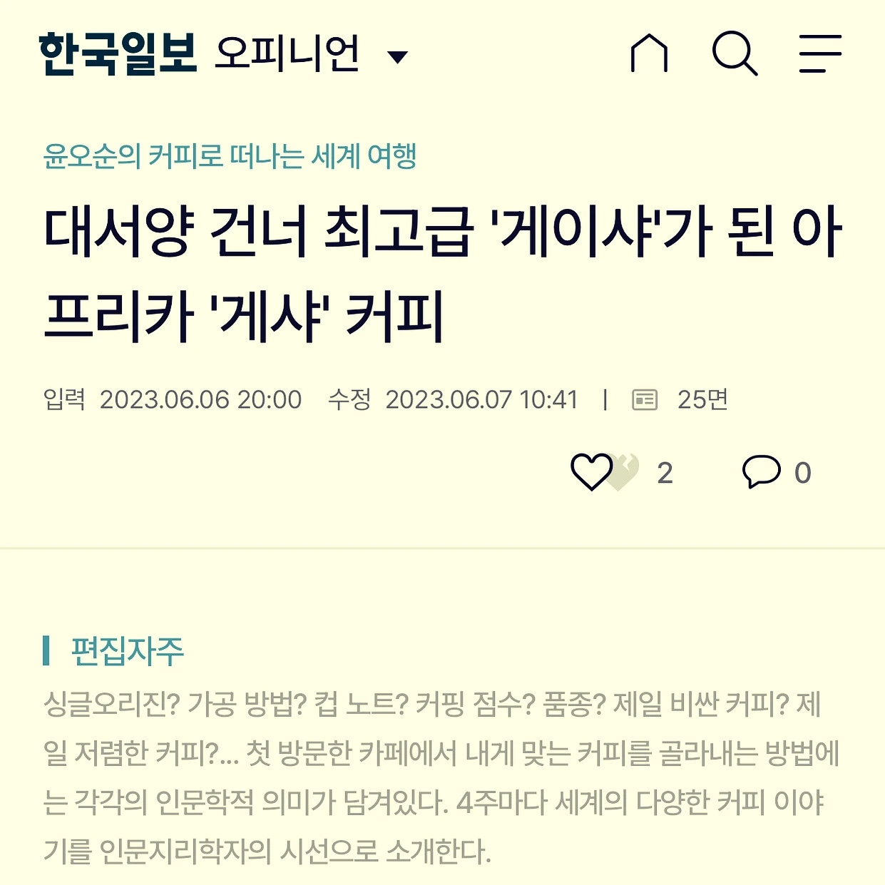 #에티오피아커피 #벨레투 #에티오피아커피클럽 #한국일보 #오피니언칼럼 #커피로떠나는세계여행 #윤오순 #파나마 #게이샤커피 #고리게샤커피 #gorigesha
