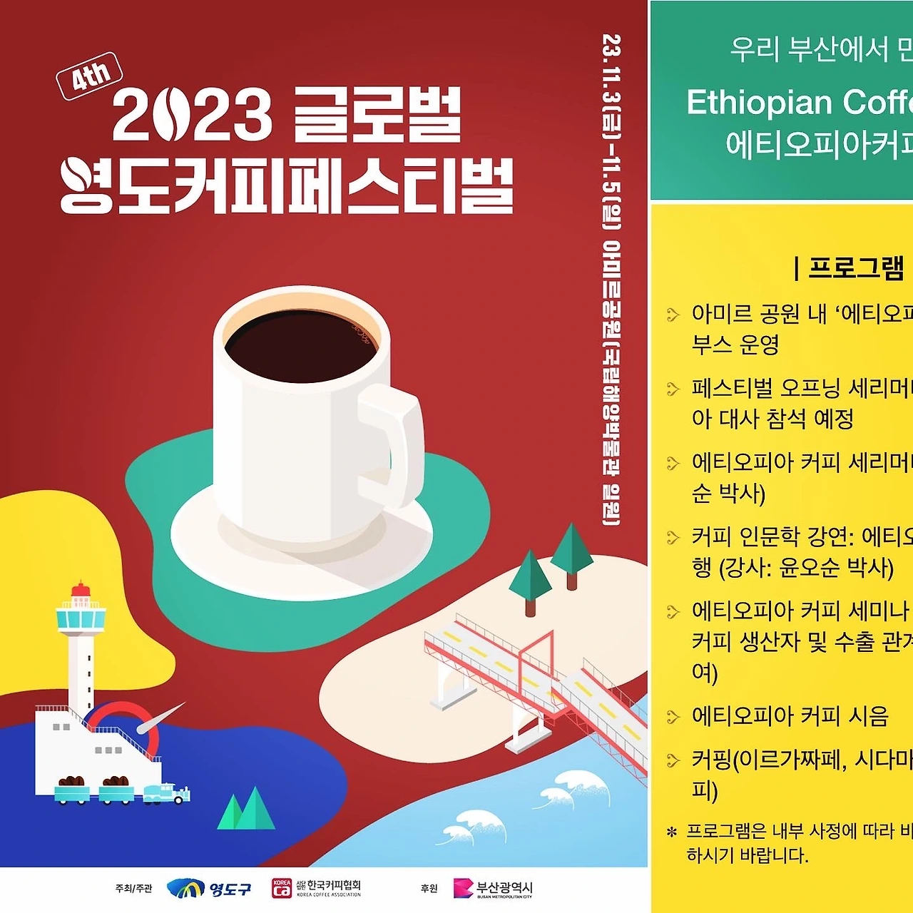 오는 2023년 11월 3일부터 5일까지 부산 영도에서 제4회 글로벌 영도 커피 페스티벌이 개최될 예정입니다. 저도 오랜만에 부산에 내려가려고 합니다. 이번에는 혼자 아니고 에티오피아 친구들 열 명과 함께 에티오피아 커피를 홍보할 예정입니다.