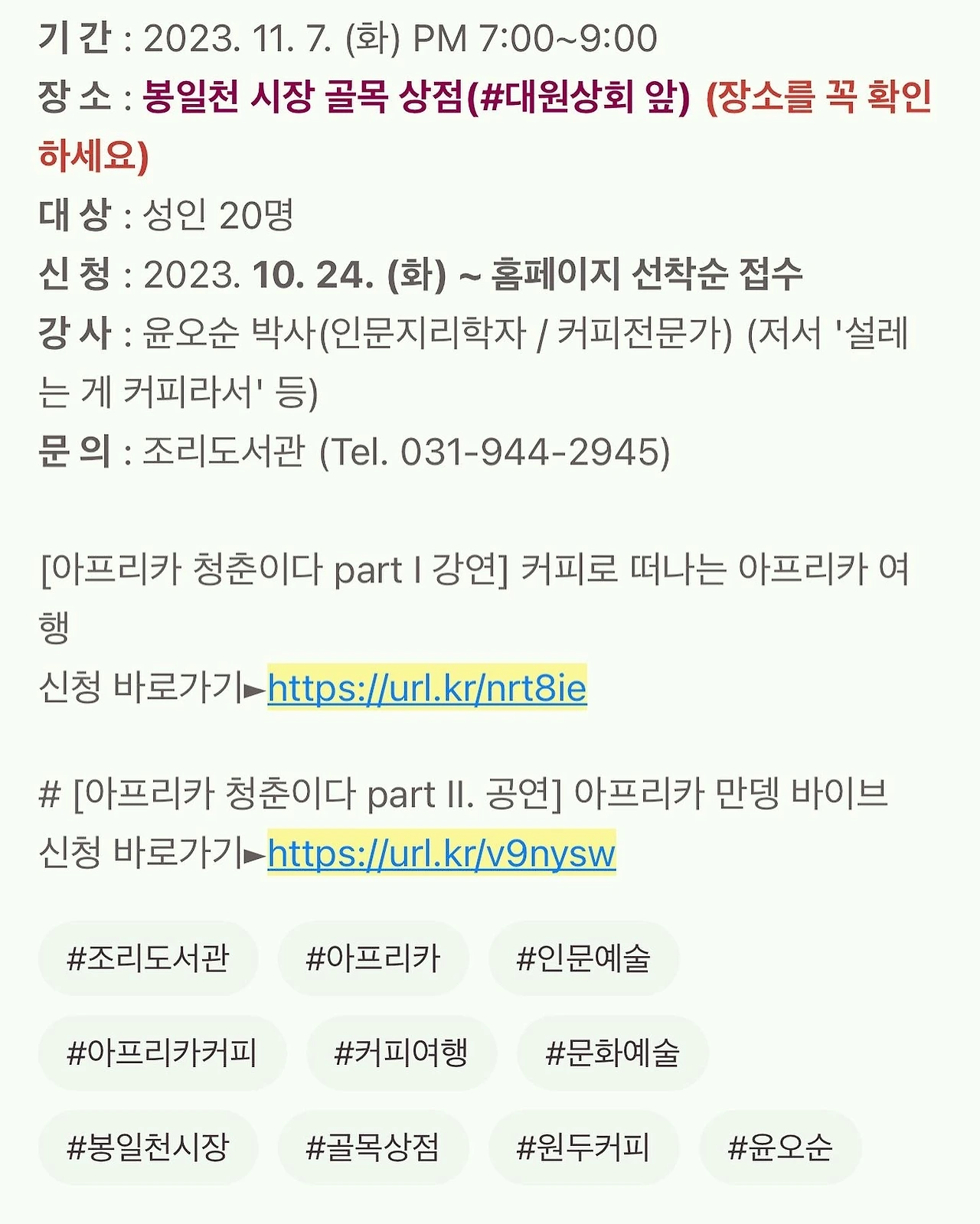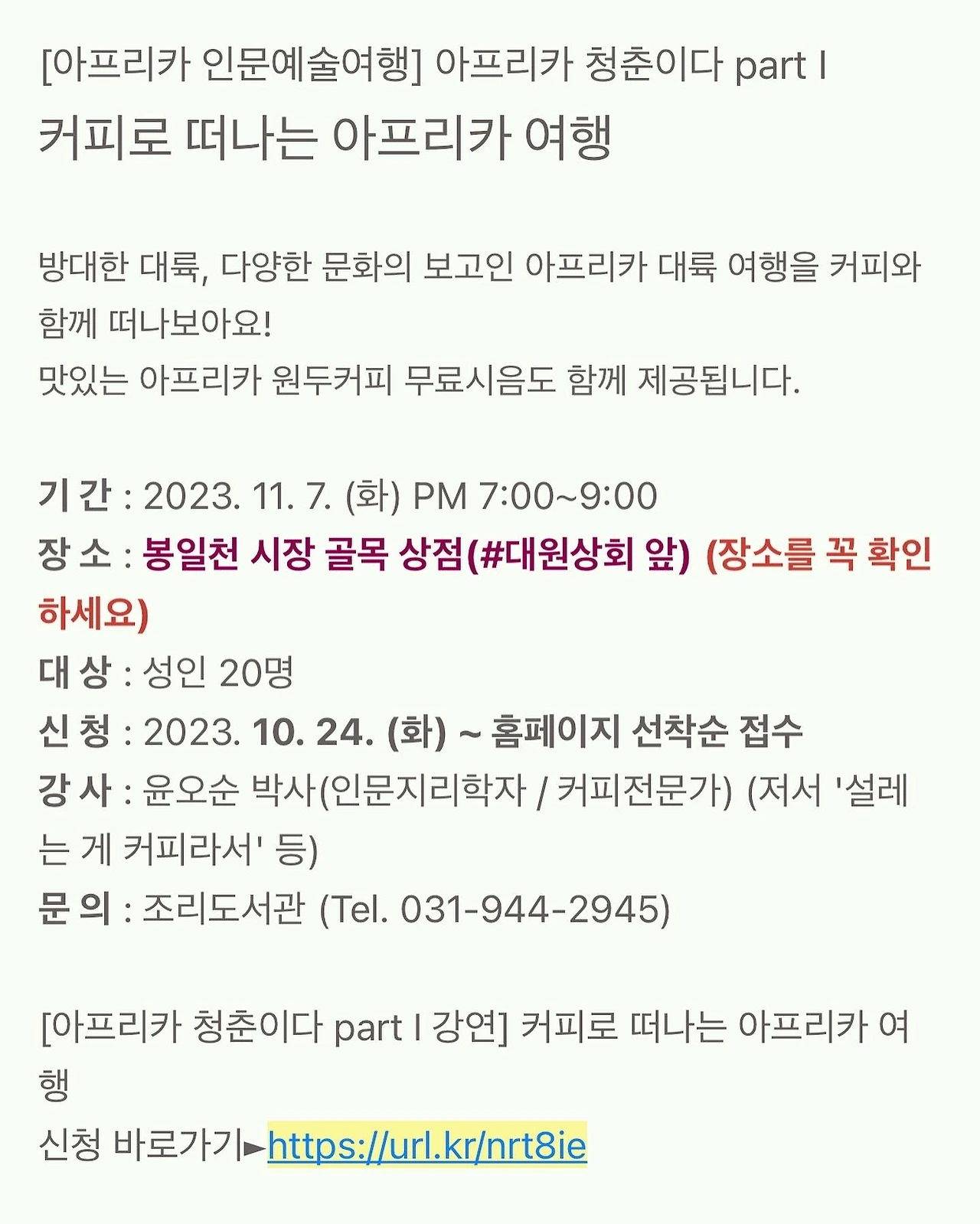 오는 11월 7일 파주의 조리도서관 초청으로 “커피로 떠나는 아프리카 여행”을 주제로 강연을 진행합니다. 강연 참가를 원하는 분들은 아래를 참고하시고, 강연 장소가 조리도서관이 아니니 꼭 확인 부탁드립니다.