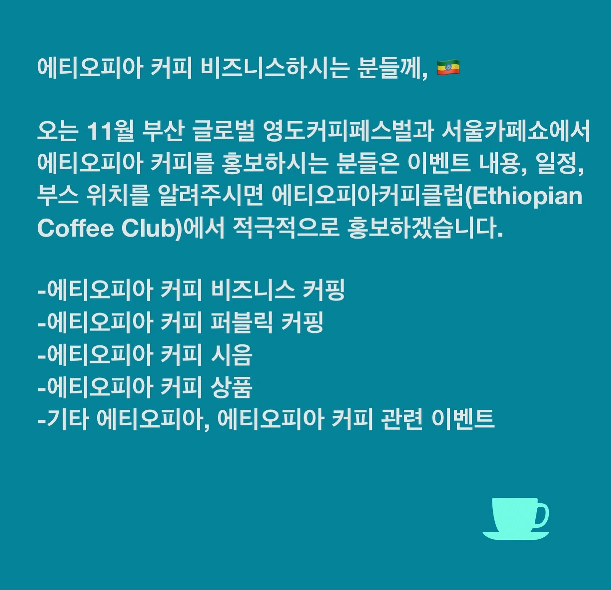 오는 11월 부산 글로벌 영도커피페스벌과 서울카페쇼에서 에티오피아 커피를 홍보하시는 분들은 이벤트 내용, 일정, 부스 위치를 알려주시면 에티오피아커피클럽(Ethiopian Coffee Club)에서 적극적으로 홍보하겠습니다.