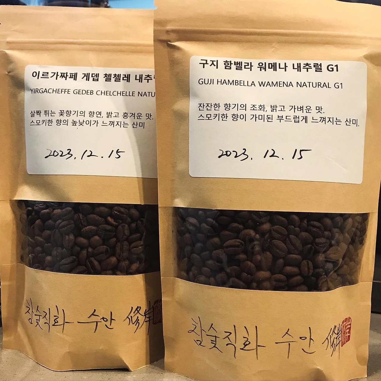 연말연시 선물로 볶은 커피가 몇 가지 들어왔는데 하나는 의도적으로 다크하게 로스팅한 커피였고(첫번째 사진), 다른 하나는 전남 목포에서 한시간쯤 차로 달리면 나오는 ‘삼호 일회사’라는 절의 주지 스님이 직접 숯불로 로스팅한 커피였다. 둘 다 내가 평소 마시는 커피보다 진하게 볶았는데 에티오피아 아볼 분나 같은 느낌의 커피로, 후미가 스모키한 게 나쁘지 않았다.