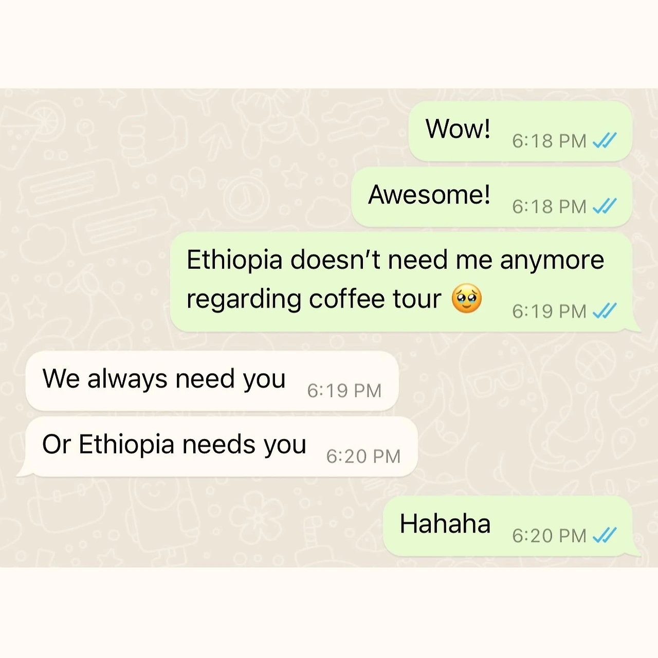 에티오피아 외교부 관계자와 이제 커피 투어와 관련해 에티오피아는 내가 필요하지 않아, 라고 했더니 우린 언제나 네가 필요하다고 답변을 해서 웃었어요.