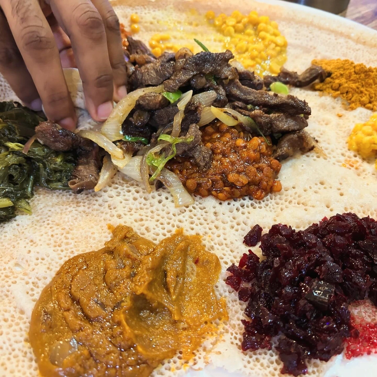 *사진에 보이는 얇은 팬케이크 같은 게 에티오피아 주식인 인제라(Injera).