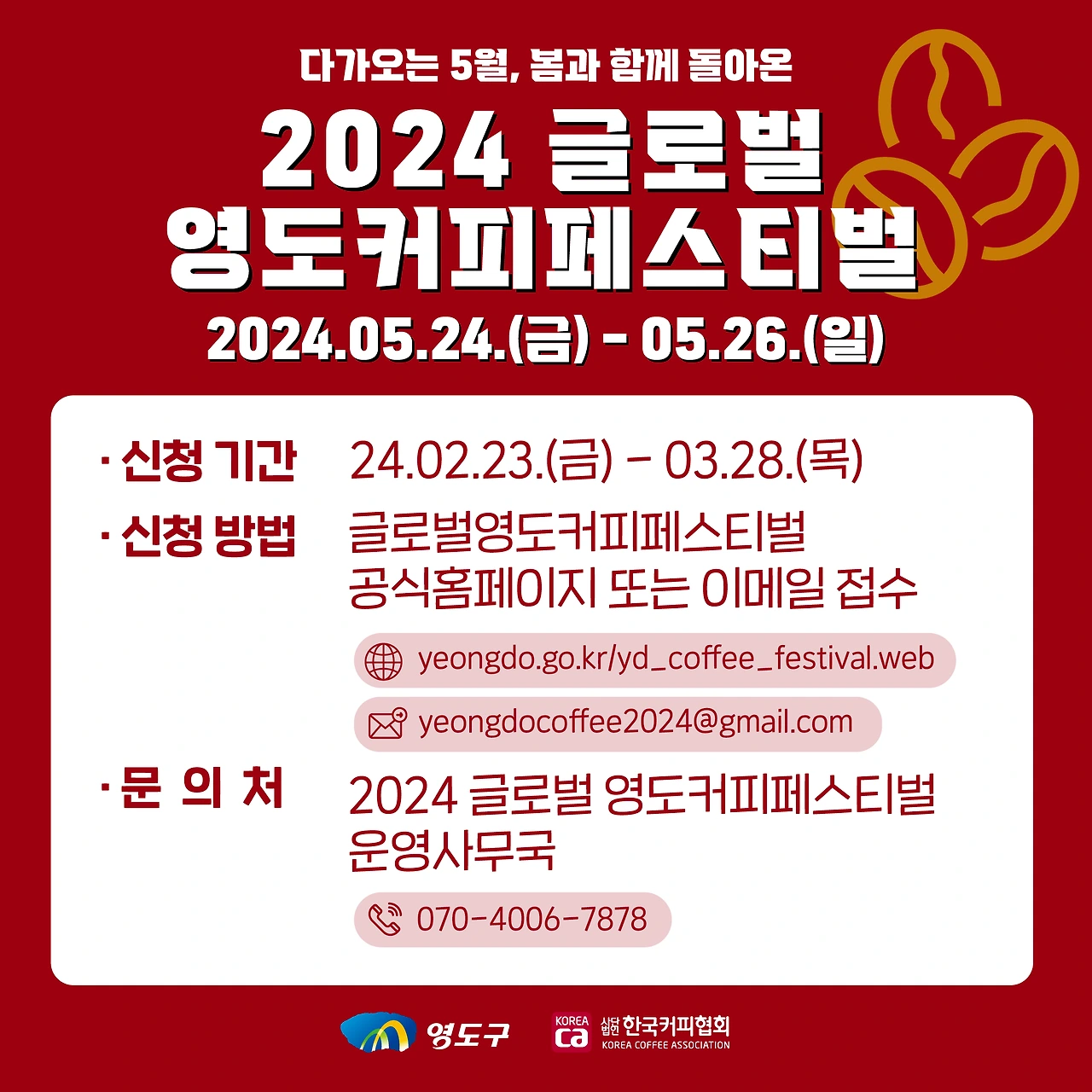 현재 부스 신청은 마감된 것 같은데 혹시 문의하실 분들은 축제 사무국으로 연락하시기 바랍니다. 5월에 부산 지역으로 나들이 계획하시는 분들은 글로벌 영도커피페스티벌에 많이 놀러오세요.