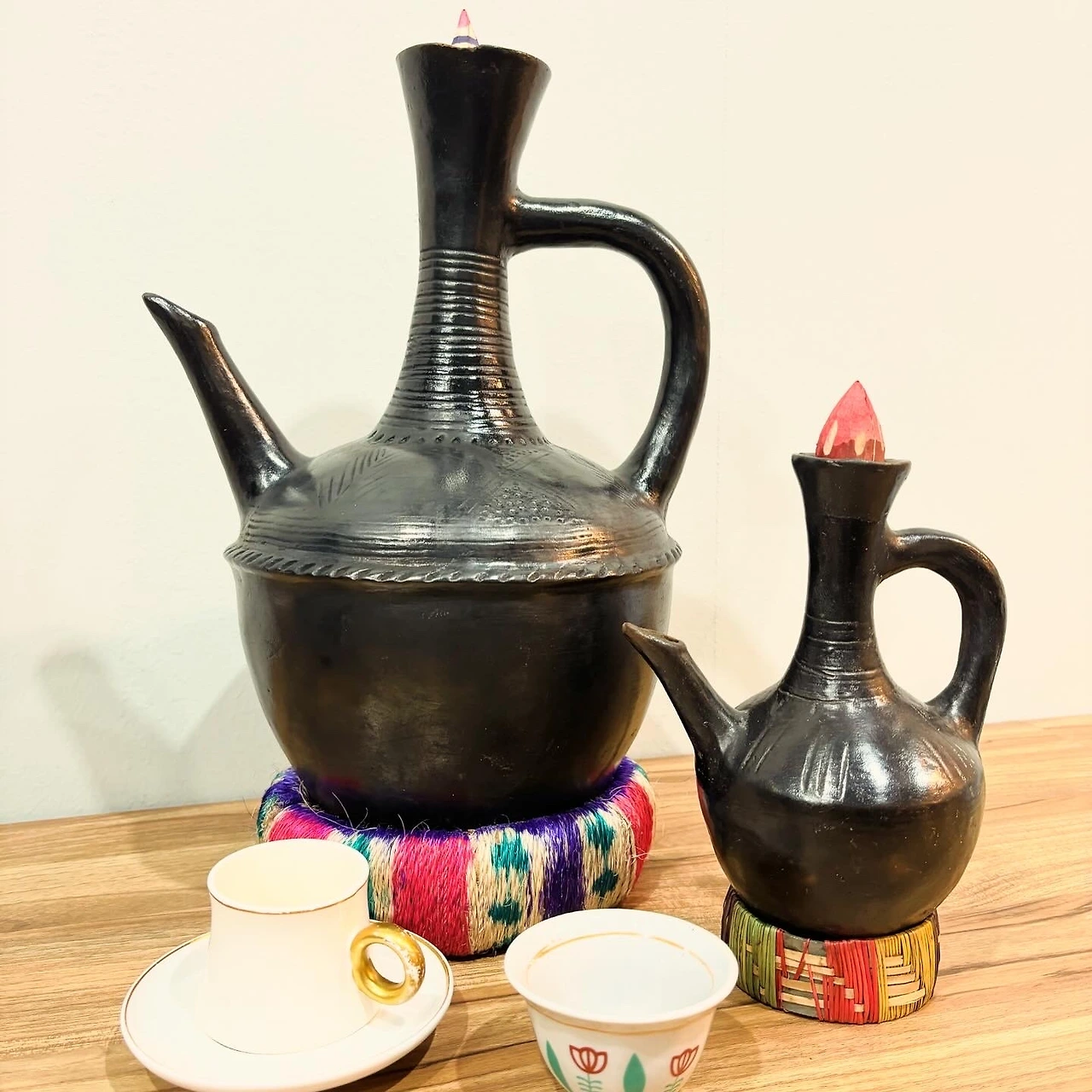 에티오피아 커피 세리머니에 사용하는 추출도구인 제베나Jebena. 큰 제베나는 이번 ‘월드 오브 커피 아시아: 부산’ 행사에서 사용하던 것이고, 작은 것은 벨레투(Beletu)에 원래 있던 것.