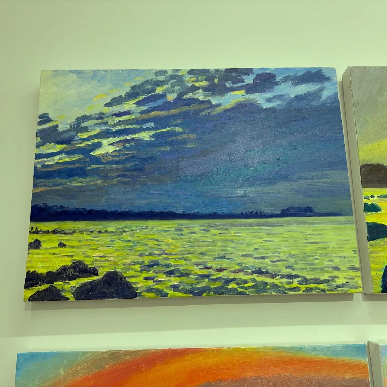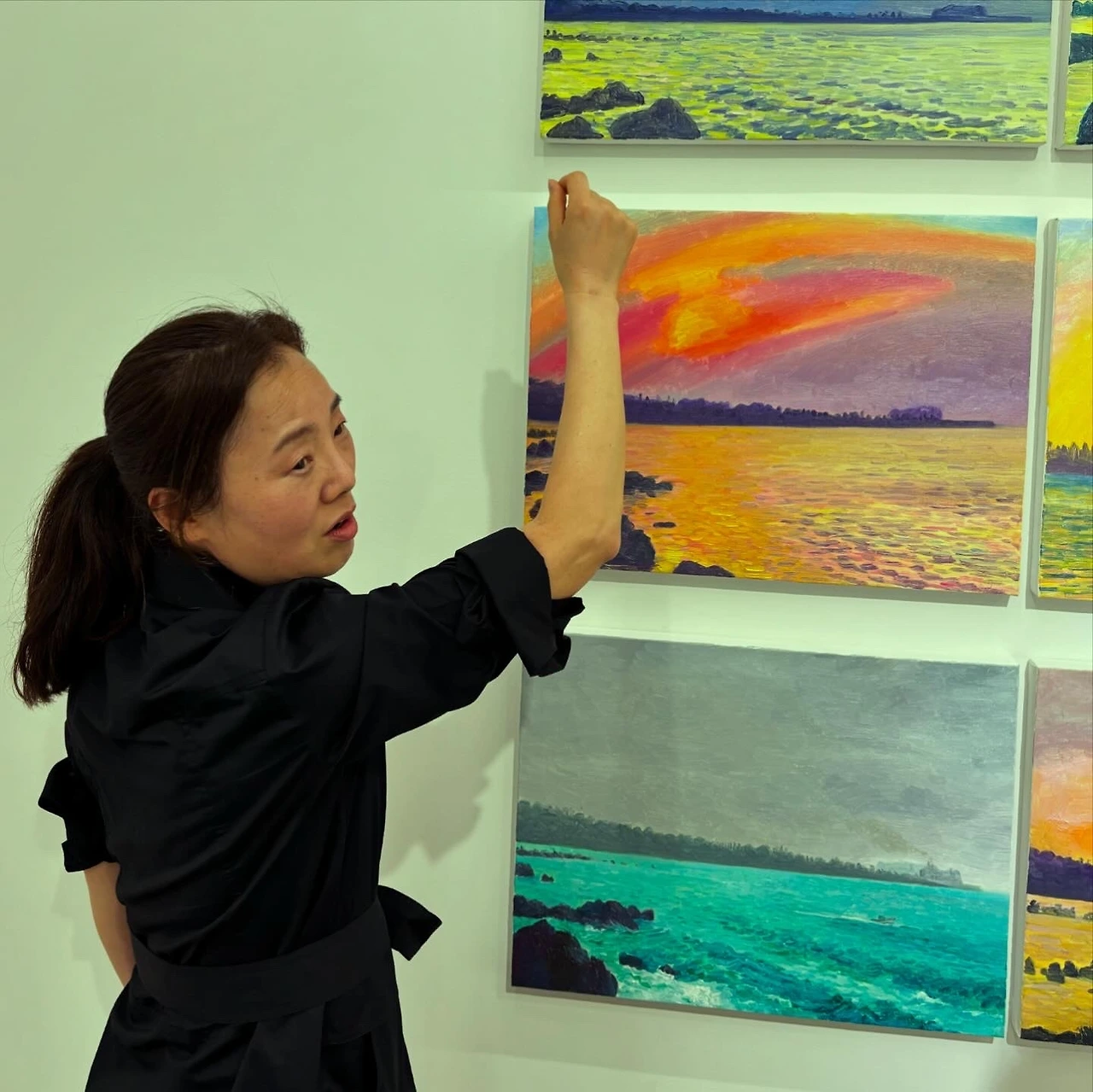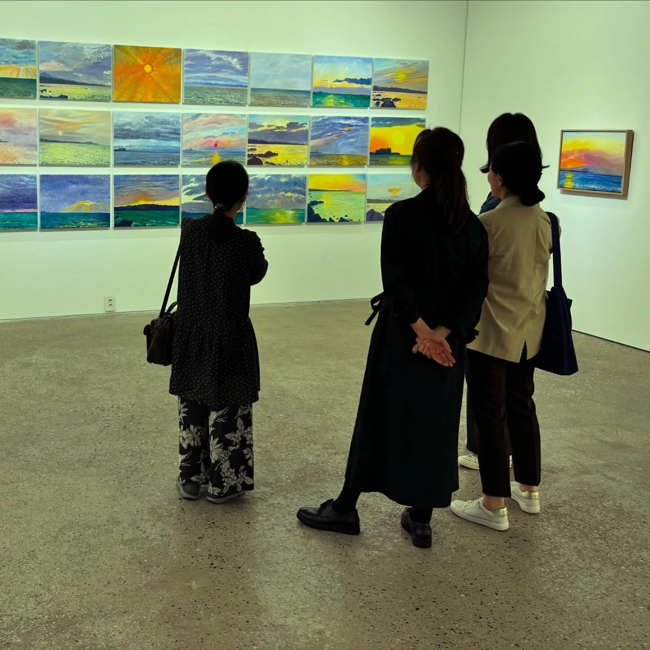 제주로 완전히 이주해서 작품활동을 이어가는 허윤희(Yun-hee Huh) 작가의 개인전이 있어 다녀왔다. 작가가 지난 겨울부터 얇은 텐트를 바람막이 삼아 매일 새벽 동틀 무렵의 태양을 그리고 있는 모습을 보며 감동을 많이 받았었다. 오늘 그 그림들을 한자리에 모아놓은 전시회 오프닝을 한다고 해서 전시장에 들렀다. 외국에서 온 손님을 인천공항에서 바래다주고 갤러리에 도착하니 문을 닫기 5분 전이었다. 작가가 늦어도 괜찮으니 오라고 했는데 가길 정말 잘했다. 허윤희 작가의 설명을 듣기도 전에 작품이 좋아 하나 구입을 했다. 작가는 그게 가장 최근에 그린 작품이었고, 그 작품을 그리기 위해 다른 작품을 그린 거라며 내가 그 작품을 골라줘서 고맙다고 했다. 전시회에서 만난 이문재 시인이 작가의 작품을 빗대어 ‘빛을, 회를 뜨다’라고 표현했는데, 너무 절묘해 여기에 기록한다.