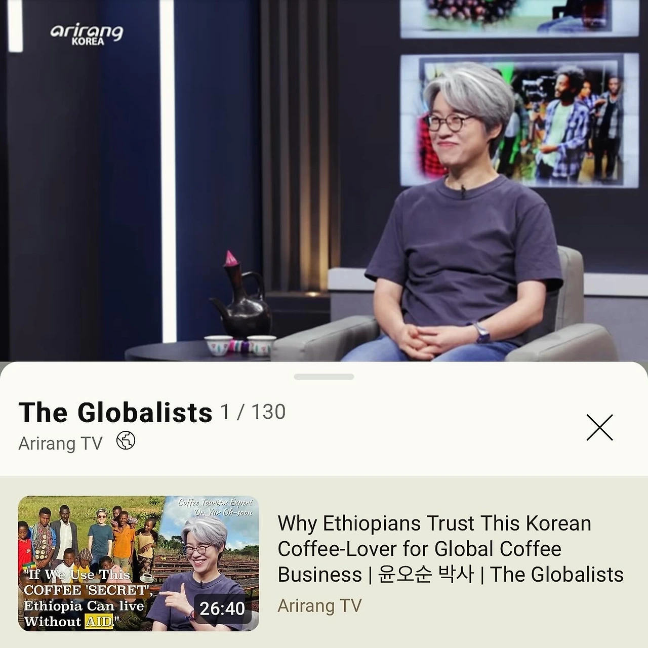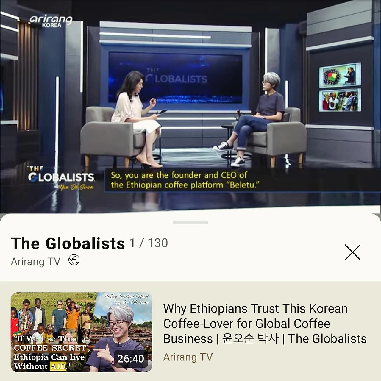전세계 108개국에 송출되는 아리랑 TV에 “THE GLOBALISTS”라는 인터뷰 관련 프로그램이 있다. 여기에 출연해서 에티오피아, 에티오피아 커피, 벨레투에 대해 소개했다.