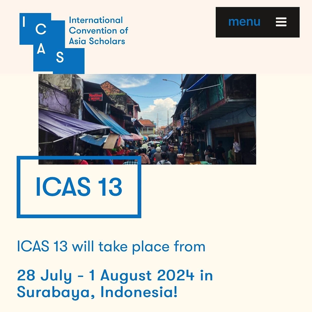 아시아 관련 주제의 연구를 하거나 아시아 출신인 학자들을 위한 대규모 학술 축제인 ICAS13이 오는 7월 28일부터 8월 1일까지 인도네시아 수라바야(Surabaya)에서 개최될 예정이다. 올해 대주제는 “Crossways of Knowledge.”