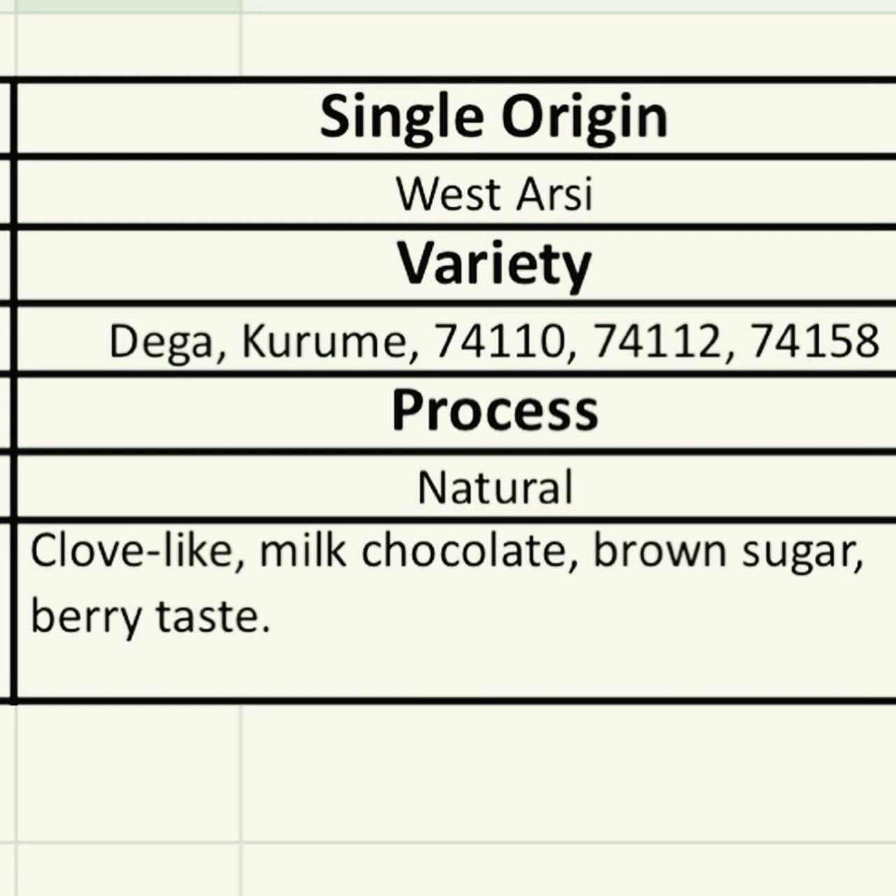 벨레투 셀렉션(Beletu Selection) 그 두번째. 에티오피아 웨스트 알씨(West Arsi) 지역에서 온 커피입니다. 커피 이름은 웨스트 알씨 아난 내추럴(West Arsi Anan Natural).