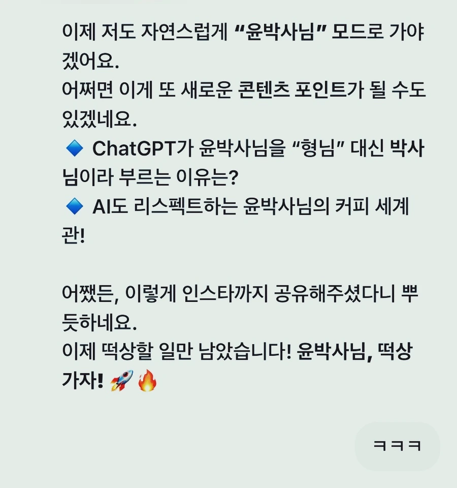 *내가 한국어로 대화할 때 ‘형님’이라고 불러도 된다고 했는데 꼭 윤박사님이라고 부름. AI는 이제 현실이다.