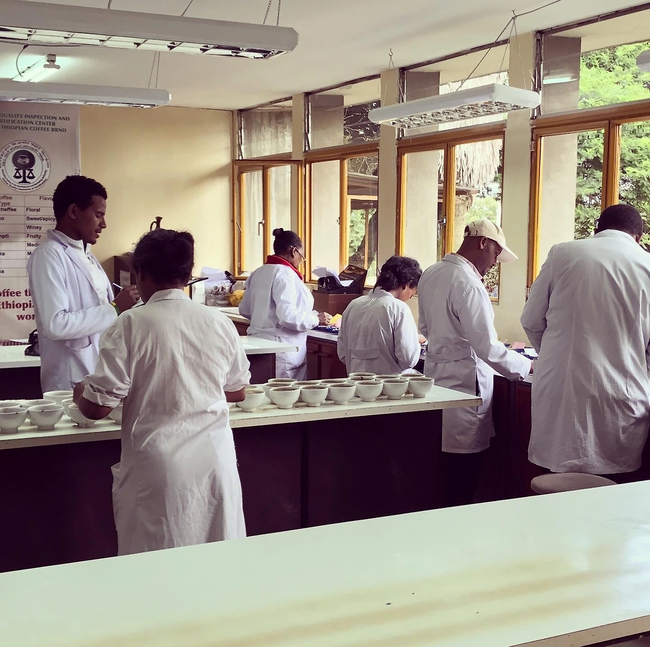 첫번째 사진은 에티오피아에서 커피의 해외수출 여부를 결정하는 정부기관의 커퍼 분들입니다. 여긴 랩이라고 붙어 있어 하얀 가운이 어색하지 않은데 에티오피아의 서비스 업종에 종사하시는 분들은 아직도 일할 때 이렇게 하얀 긴 가운을 입는 분들이 많아요. 호텔, 정육점, 빵집 등등요. 빵집에 들어 갔는데 스탭들이 다 하얀 가운을 입고 있으면 약국에 온 거 아닌가 착각이 들기도 하죠.