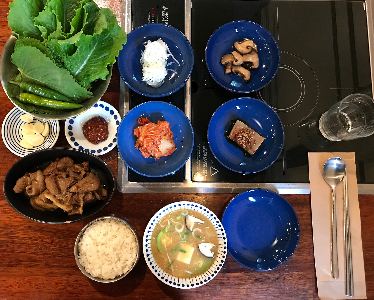 반찬은 흔한 기사식당 메뉴인데 훨씬 정갈하고 아무튼 나랑 맞아. 수저도 개별포장해서 나오고. 된장찌개는 차돌박이를 넣어 구수하면서 고소해. 같이 따라 나오는 생야채는 늘 신선해서 보기만해도 행복했는데 청양고추 빼고 항상 다 먹어. 나 사실 매운 거 잘 못 먹거든. 고기도 파는 집이라 점심엔 백반 팔아주고 저녁에는 내가 가르치던 학생들 데려다 고기 시켜서 매상도 많이 올려주고 그랬지. 이제 다 옛날 이야기야.