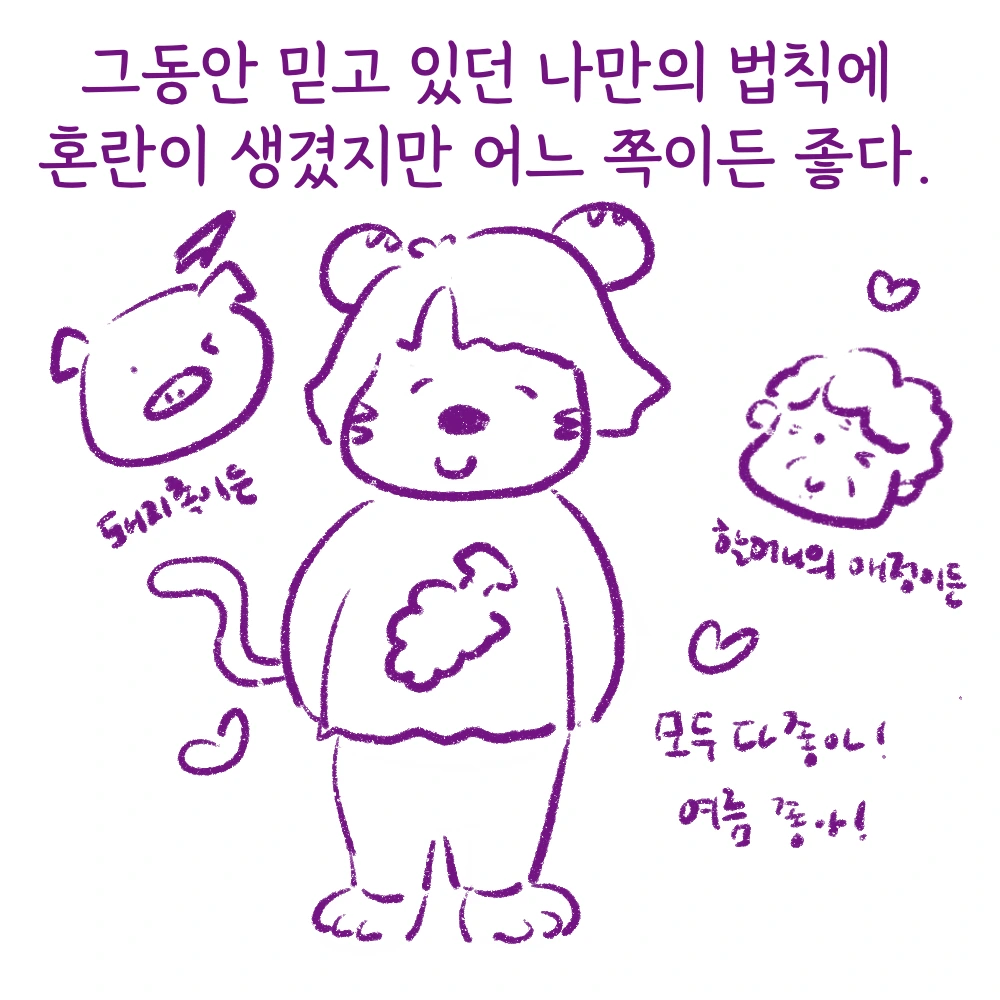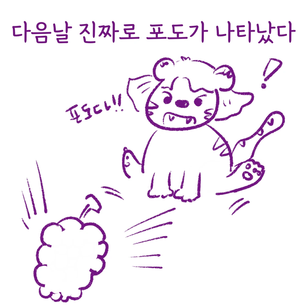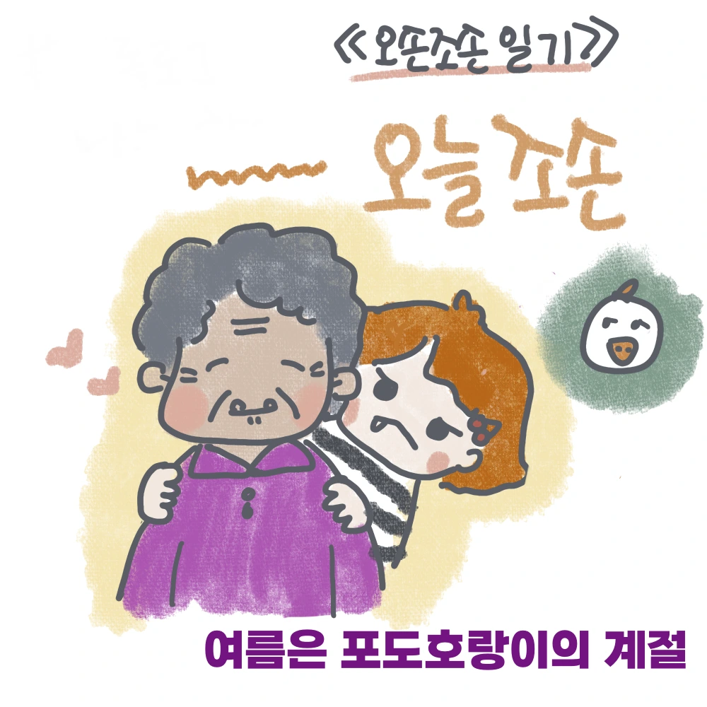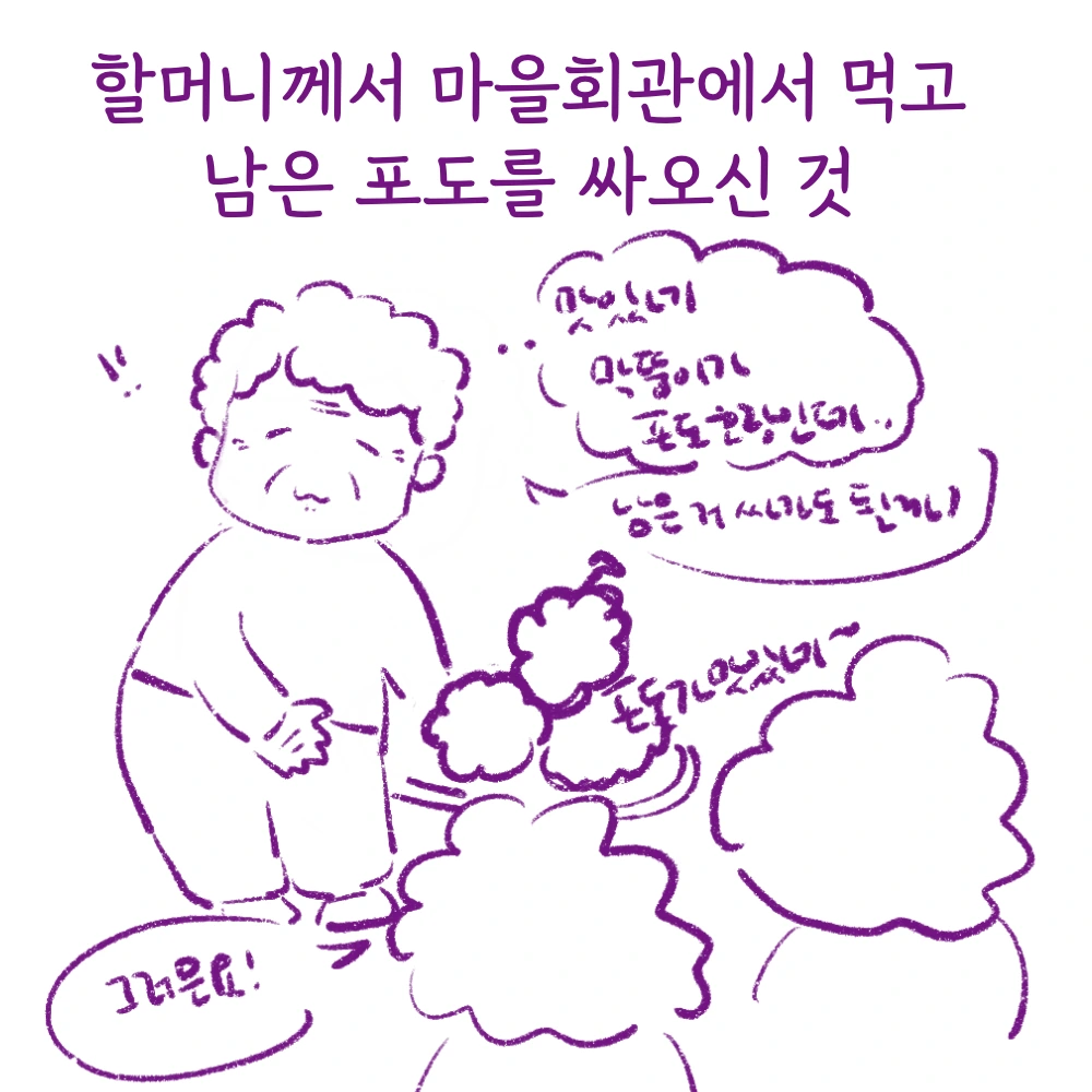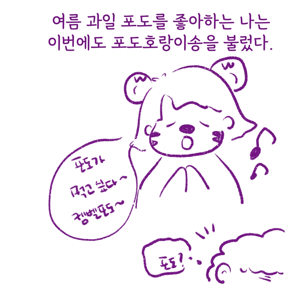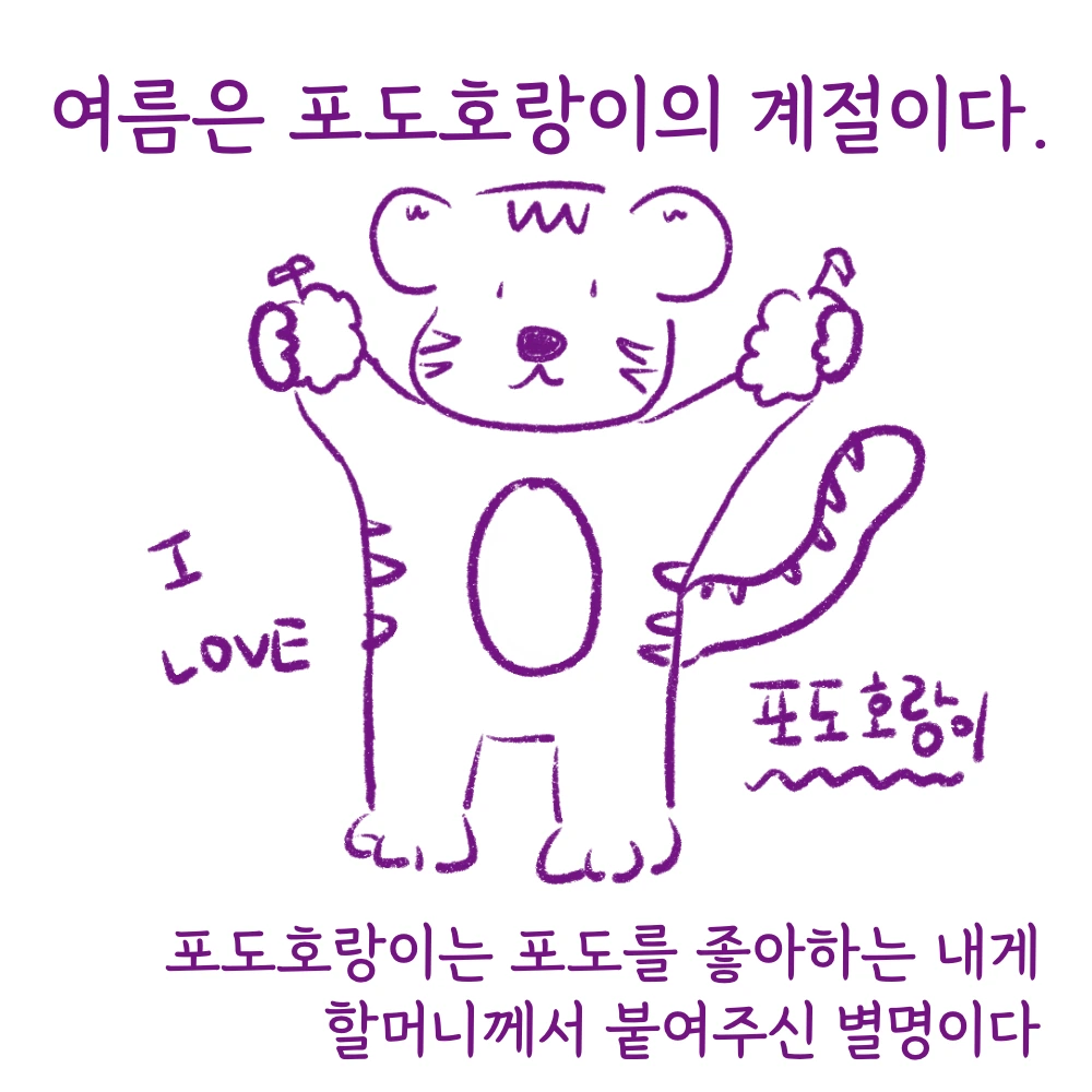 여름은 포도호랑이의 계절이다. 나는 여름 과일을 특히 좋아하는데, 그중에서 복숭아와 포도가 최애다. 닭(=언니)은 과일을 별로 좋아하지 않는 편이라, 과일들은 거의 내 차지인데, 순식간에 포도 한 송이를 격파한 내 모습을 보며, 할머니는 껄껄 웃으시며 ‘포도호랑이’라고 별명을 지어주셨다. 가끔 시장에서 포도를 사 오실 땐, ‘막뚱이가 포도호랑이라 사 왔다’고 하시곤 한다. 그런데 문제는 할머니께서 시장에서 주로 사 오시는 포도는 껍질째 먹는, 껍질과 알맹이가 분리되지 않는 포도라는 것. 할머니, 나는 껍질이 벗겨지는 한국식 포도(켐벨포도)를 좋아해…
