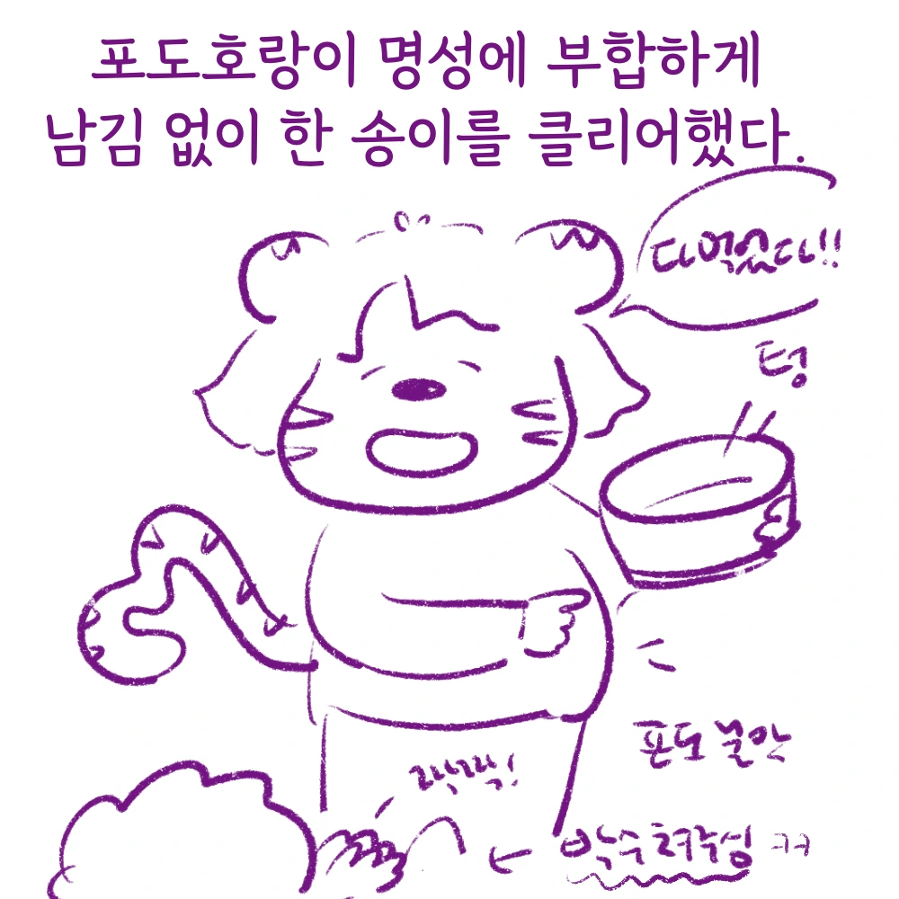 별명은 강력한 힘을 발휘한다. 어쩌다 한 번 별명이 붙여지게 되면, 그 명성에 부합하도록 조금은 호들갑 떨어야 한다. 이번에도 포도호랑이의 명성에 금 가지 않도록 열심히 포도 먹방을 찍었고, 할머니는 깨끗이 클리어한 걸 보며 아주 기뻐하셨다. (참고로 무엇인가 음식을 좋아한다고 말하기 전에 신중할 필요가 있다. 특히 할머니에게는. 아는 동생은 치킨 껍질을 좋아한다고 했다가, 닭 껍질이 가득 담긴 닭죽 그릇을 받게 되기도 했다. 물에 빠진 닭이 아니라 기름에 튀긴 닭인데! feat. 집으로)