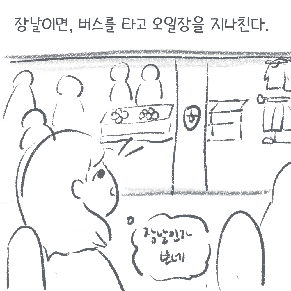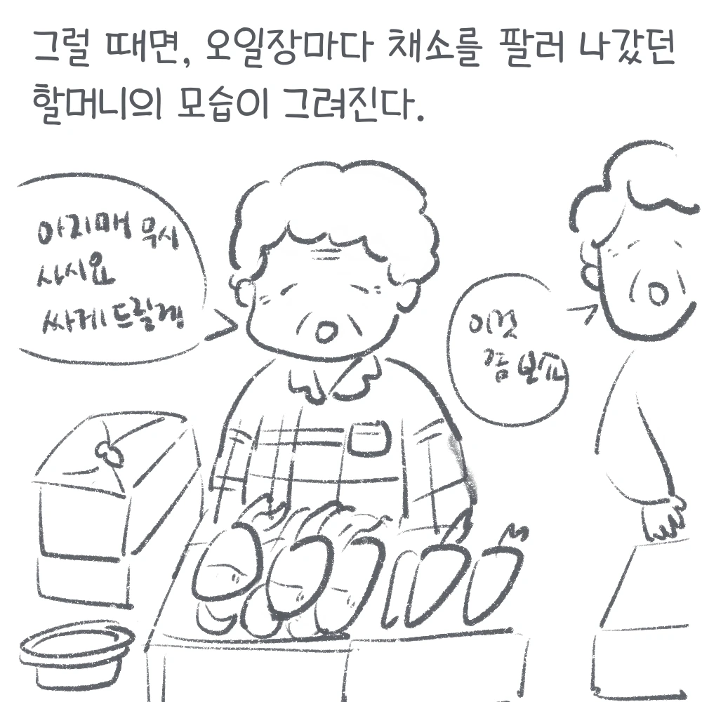 길거리에서 할머니들을 마주치면, 특히 생계 활동을 하고 계신 할머니들을 볼 때면 자연스럽게 할머니가 떠오릅니다. 지금은 언제 그런 적이 있었나 싶을 정도로, 까마득한 추억이 되어버렸다는 게 신기하게 느껴지기도 합니다. 할머니의 오일장은 할머니뿐만 아니라 우리에게도 매우 큰 이벤트였기 때문입니다. 오일장에 얽힌 추억들이 많은데, 너무나 당연했던 일상이 이제는 추억 속에서도 옅어지고 있습니다. 언젠가 써야지 하고 마음먹었던 오일장의 기억들을 조금씩 써나가고 싶습니다.