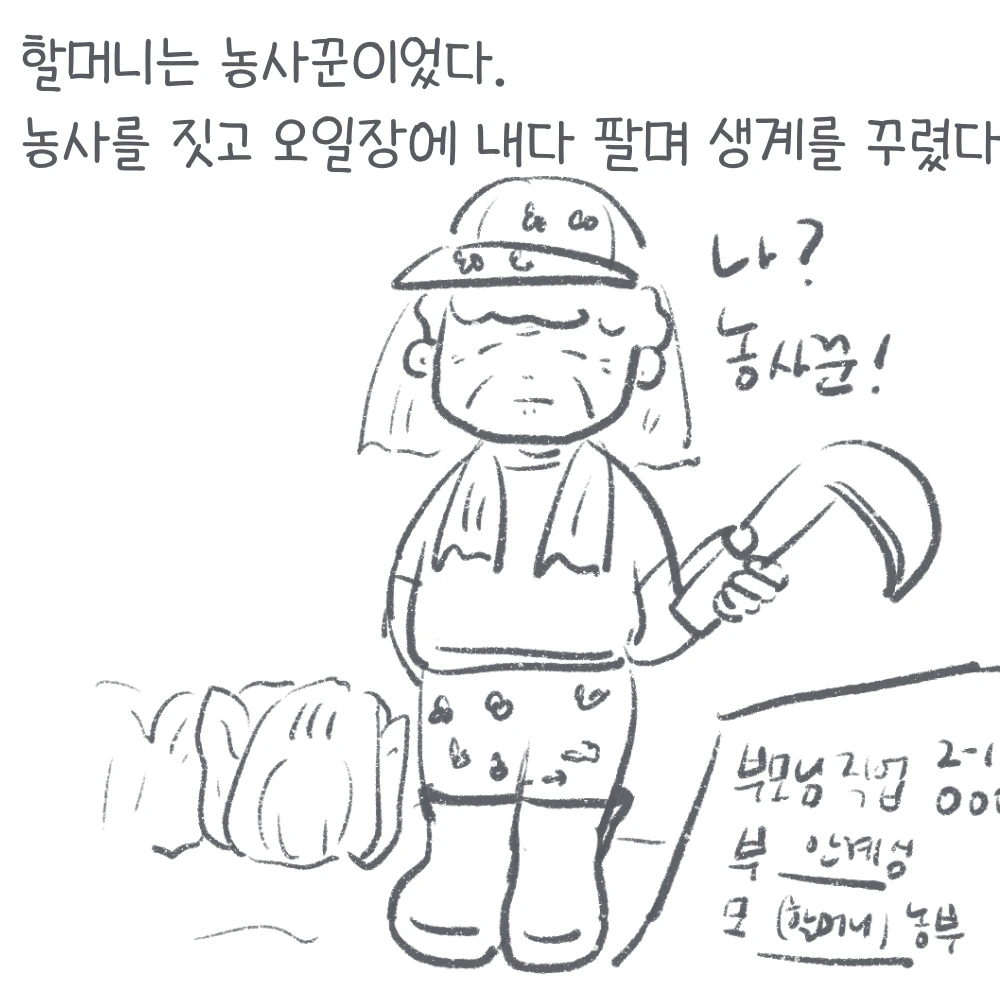 할머니의 직업은 엄밀히 따지면 농부였다. 초등학교에 입학한 이후, 고등학교 때까지 매년 부모님의 직업에 대한 질문에 답을 적어서 내야 했었는데, 그 답은 항상 주부와 농부 중 하나였다. 어렸을 때 할머니는 뭐 하는 사람이냐고(새삼 글로 적으니 조금 이상하네) 할머니께 여쭤보면 할머니는 스스로를 ‘농사꾼'이라고 대답하곤 했다. 농사를 짓는 사람이기도 하지만, 할머니는 장사꾼이기도 하니까, 어떻게 보면 할머니가 말씀하신 대로 ‘농사꾼’이 더 적합할지도 모르겠다.