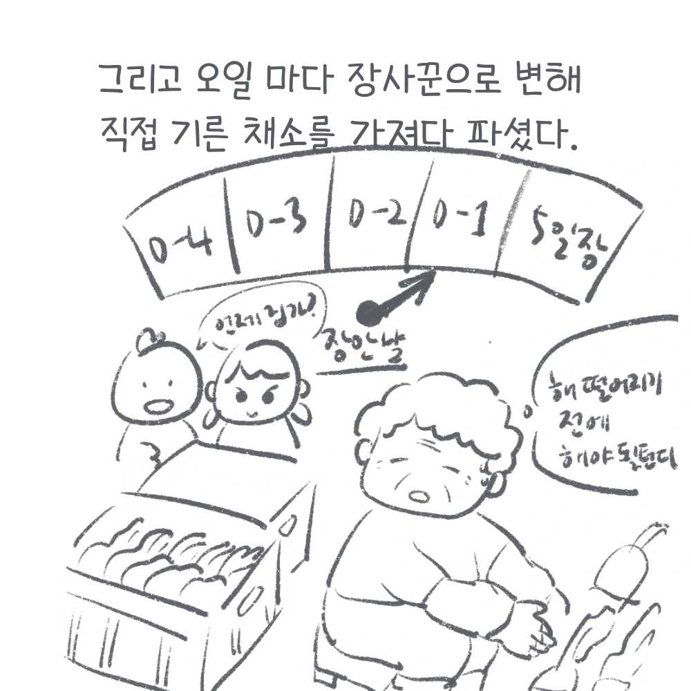 시골에서는 일주일의 7일 주기보다는 오일장의 5일 주기가 더 중요하게 여겨지기도 한다. 특히 무언가를 팔아 생계를 이어나가야 하는 경우에는 5일장의 루틴에 따라서 한 달이, 그리고 일 년이 짜인다. 우리 할머니는 4일 동안 부지런히 기르고, 장안날(=오일장의 전날을 의미한다, 그날이면 온 동네가 바쁘다.)에 수확을 마친 장거리(=장에서 팔 상품을 의미한다)를 오일장에 가져다가 팔았고, 그게 우리의 생계수단이었다. 할머니는 손으로 직접 심은 채소 오일장에 내다 파시며 그 손으로 식구들을 먹여 살리셨다.