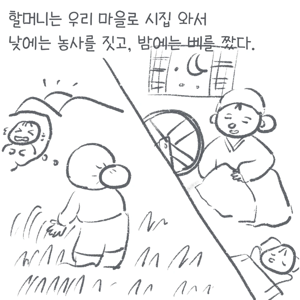 할머니는 한국전쟁이 발발한 지 얼마 되지 않을 때 우리 마을에 큰며느리로 시집와서는 으레 시골 아낙네들이 그러했듯 자식들은 시어머니께 맡기고, 동틀 무렵부터 해가 저물 때까지는 논에서 일을 하고, 저녁에는 길쌈을 하며 베를 짜고 틈틈이 살림을 챙겼다. 지금으로 치면 N잡러, 혹은 워킹맘이라고 볼 수 있지만, 그때는 그게 당연한 것이었다고 한다. 거기에 더해진 중요한 임무는 오일장에 가는 것이었다.