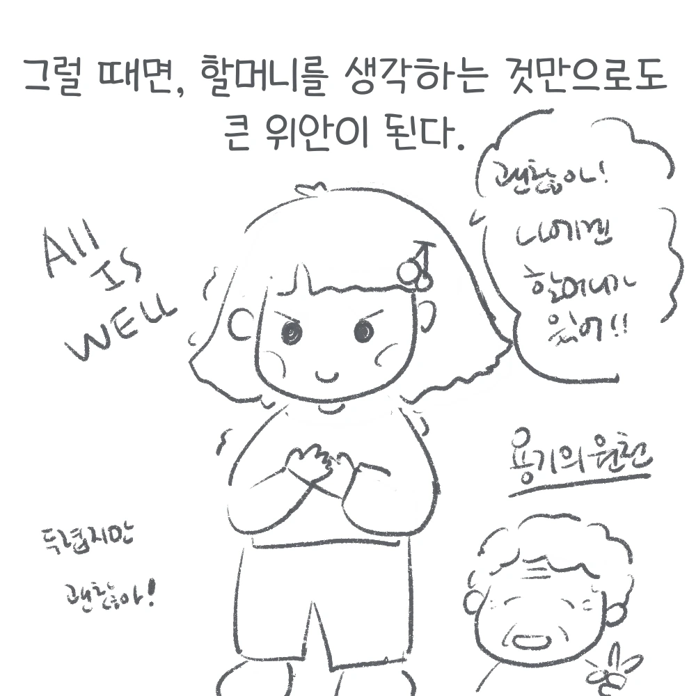 어려서부터 새로운 환경에 잘 적응하지 못했던 나는, 인생에서 마주하게 되는 전환점 앞에 늘 어려워했다. 남들보다 적응이 더 걸리는 나는, 새 학년으로 올라가거나, 갑자기 서울에서 대학생활을 하게 되고, 또 직장에 첫 출근을 하는 등 여러 첫 순간들 마다 할머니가 먼저 생각났다. 좋은 일이 있을 때만 마찬가지지만, 힘들 때면 할머니를 생각하는 것만으로도 마음의 위안이 된다. 나보다 나를 걱정해주시는 할머니를 생각하는 것만으로도 나는 더 이상 혼자가 아닌 게 된다. 할머니가 나를 찾아오셨던 그때처럼, 내 마음속에 할머니가 방문하신다. 용기를 내라고.