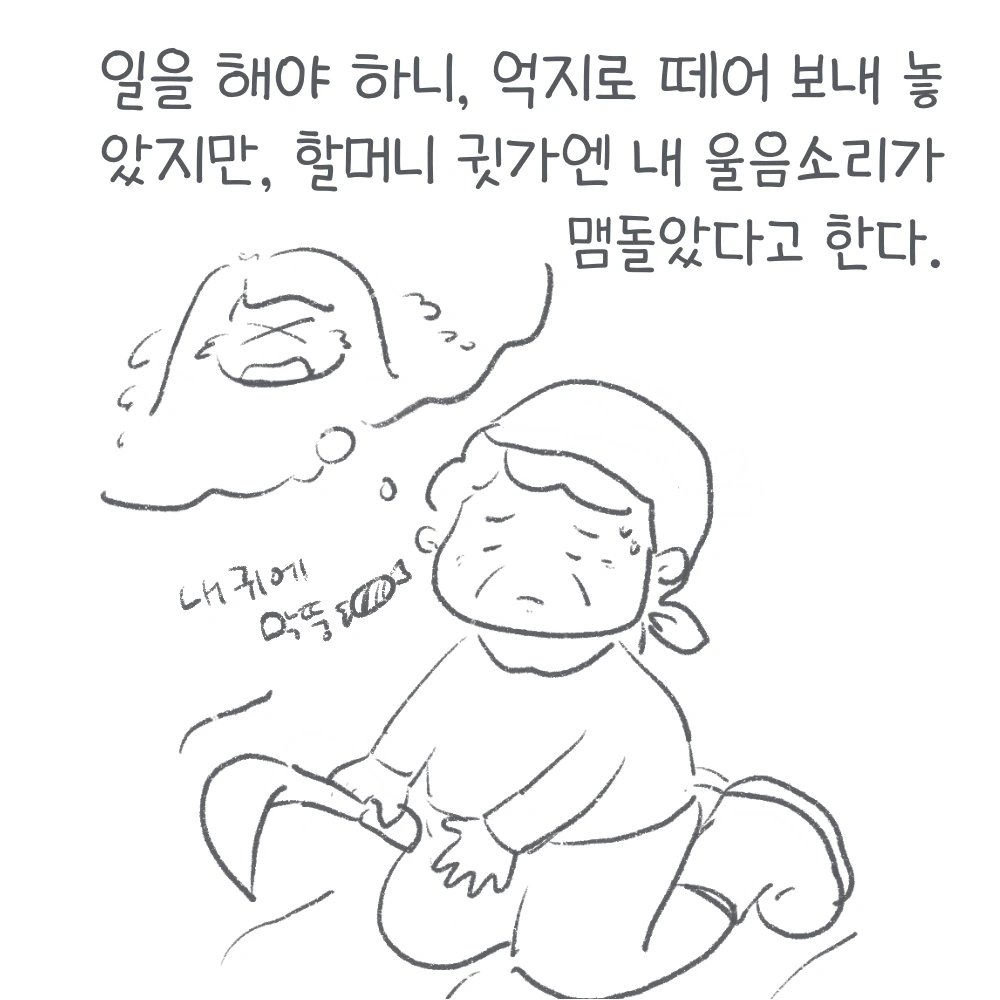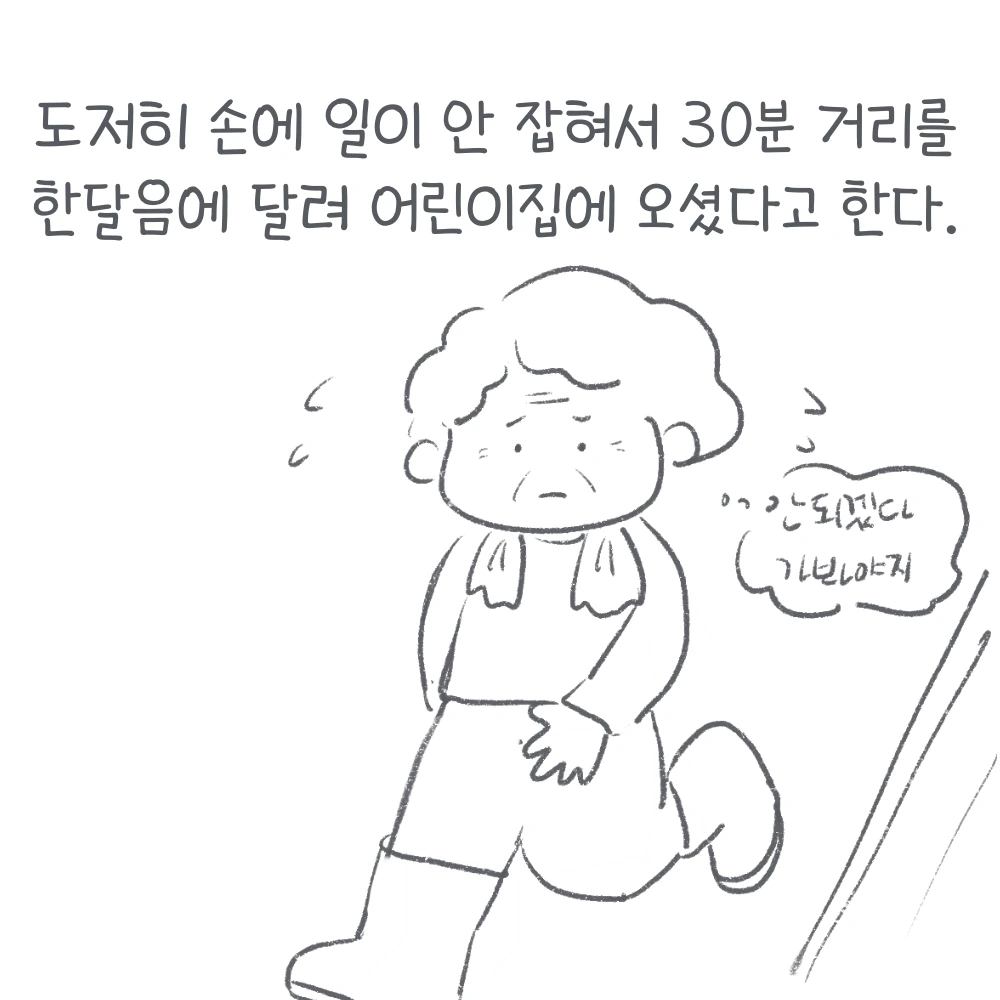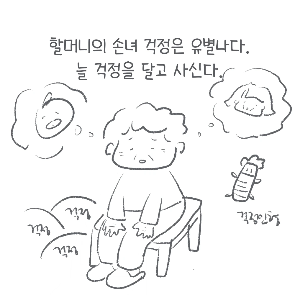 힘든 순간에는 가장 먼저 떠오르는 사람은 할머니다. 할머니는 이 지구상에 나보다도 더 내 걱정을 하는 아마도 유일한 존재이기 때문이다. 할머니는 엄하고 무서운 호랑이 할머니였지만, 손주 걱정만은 마을 사람들 말에 따르면 ‘유난’이었다. 할머니의 걱정과 정성은 내가 어린이집에 막 다니기 시작한 순간으로 거슬러 올라간다.