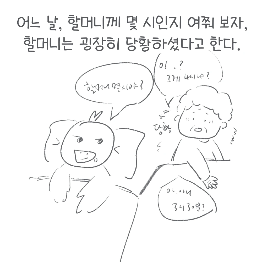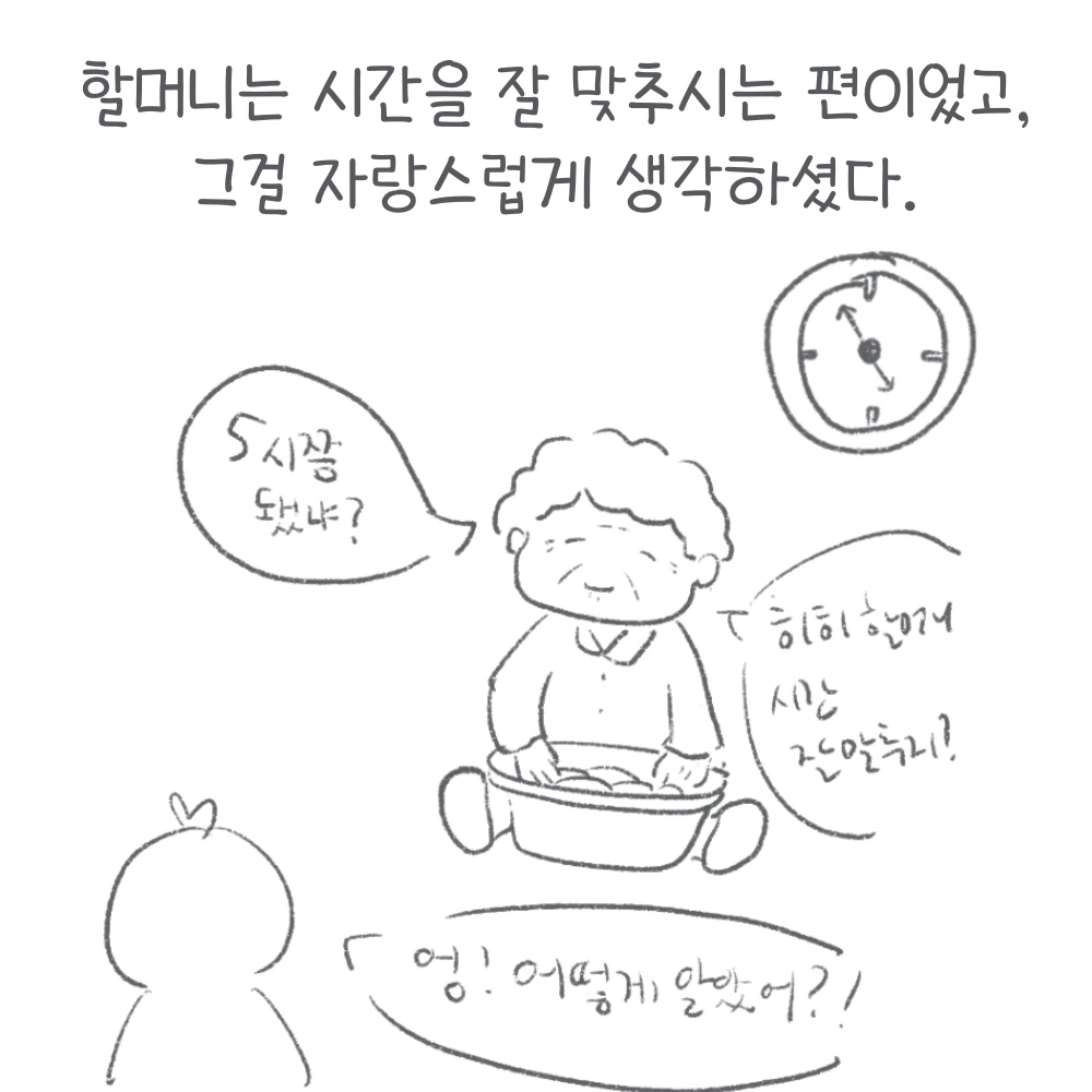 할머니는 시간 맞추는 걸 좋아하고, 또 잘했다. ”대충 5시쯤 됐냐?” 이런 식으로 물어보는 일이 많았다. 거의 30분 오차 범위 내로 근접했다. 내가 놀라 “할머니 어떻게 알았어?”라고 물으면, “봐, 할머니 말이 맞지?”하며 뿌듯하게 웃으시곤 했다. 그러다가 내가 대학에 들어간 이후에서야 언니가 걸어온 통화로 할머니의 뜻밖의 비밀을 알게 되었다. 할머니가 실은 아날로그시계를 읽을 줄 모른다는 걸. 내가 당연하게 생각했던 게 당연하지 않을 수도 있다는 것.