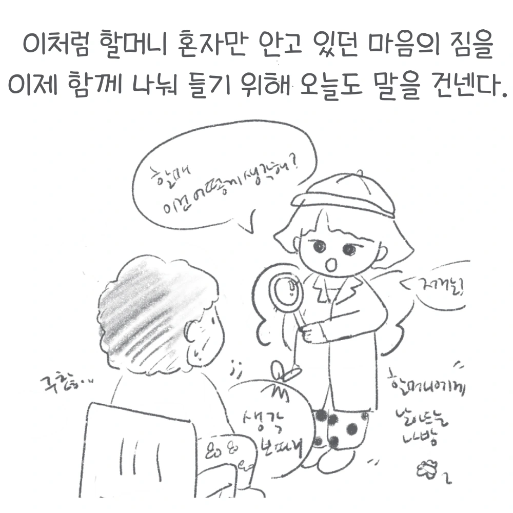 나는 또 살면서 어떤 몰랐던 사실과 생각들을 알게 될까. 할머니의 어떤 새로운 모습들을 알게 될까. 할머니를 내 생각대로 판단하고 짐작하지 말자고 다짐하며, 그러지 않기 위해 또 할머니께 말을 건다. 이미 수차례 들은 이야기일지라도 미묘하게 달라지는 소소한 변화들을 발견하며, 잊지 않기 위해 또 적는다. 할머니가 혼자만 꽁꽁 무겁게 들고 있는 마음의 짐을 나눠 들 수 있을 때까지.