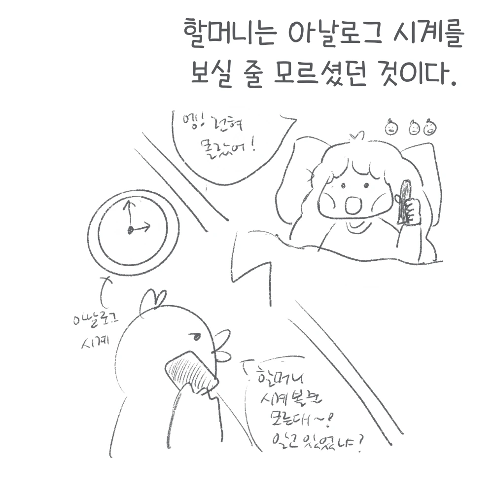 이제 할머니는 아날로그시계를 굳이 볼 필요가 없어졌다. 할머니에게도 휴대폰이 생겼기 때문이다. 시간을 알고 싶으면 이제 언제 어디서나 당당하게 휴대폰을 열고 시계를 확인하고, 우리가 집에 돌아올 때가 되었는지 아닌지 확인하실 수 있게 되었다.