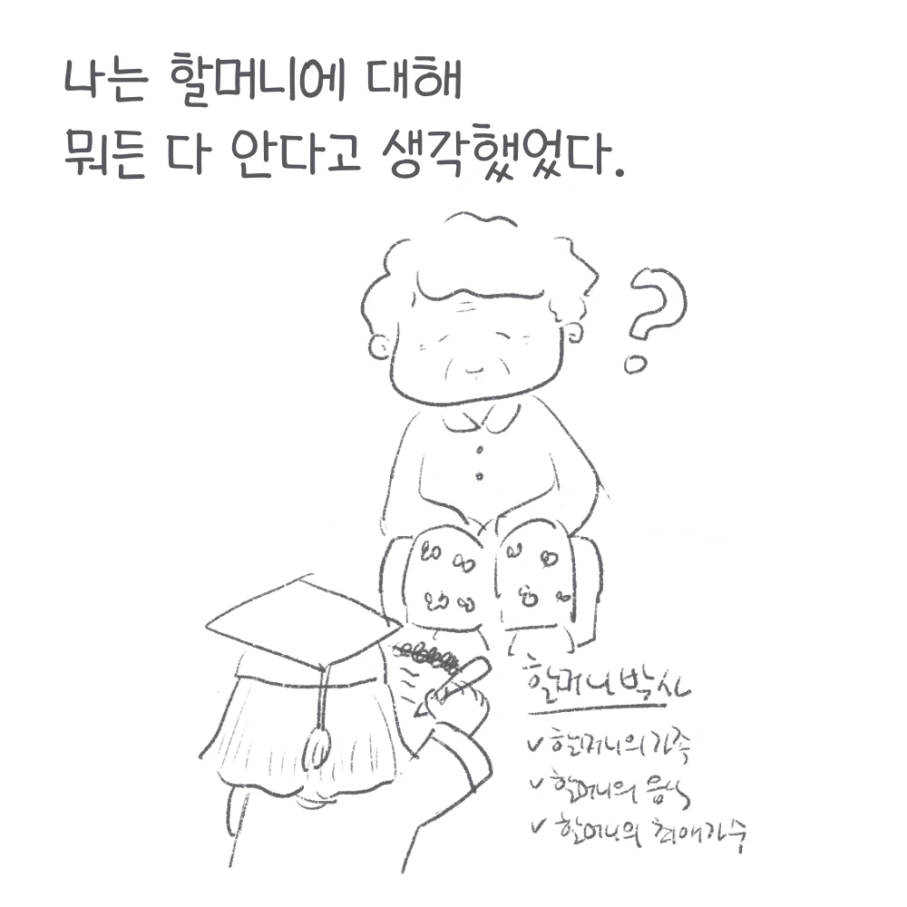 우리는 각자의 시선으로 세상을 바라보기 때문에, 타인 또한 내 기준으로 쉽사리 지레짐작하기도 한다. 함께 한 시간이 길수록 누군가를 다 안다고 착각하기 쉬운데, 특히 가족이 그렇다. 나도 내 자신이 할머니에 대해서는 모든 다 아는, 할머니 전문가라고 생각했었다. 할머니와 나눈 수많은 대화 속에 내가 태어나기 전의 가족의 역사나, 할머니의 한, 할머니의 학력, 할머니의 부모님 이름, 할머니의 할아버지, 가족 고향 이야기 등 할머니의 삶의 여정을 이미 한번 머릿속으로 그려봤기 때문이다. 하지만 그러다가 종종 깨닫는다. 내가 아는 할머니, 즉 내가 생각하는 할머니가 할머니의 전부는 아니라는 것.