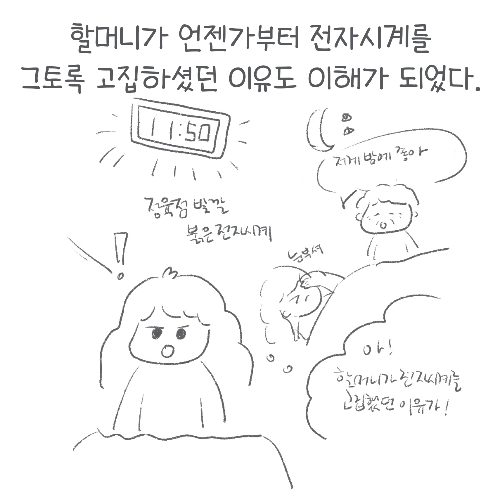 할머니의 소소한 비밀이 알려지자 할머니는 특유의 머쓱한 웃음을 지으셨다. 퍼즐이 맞춰지듯 떠오른 또 하나의 장면은 우리 집 방에 빨간 불빛이 강한 전자시계를 들여다 놓았던 일. 빨간 불빛이 방안을 정육점 빛깔로 만들며 수면을 방해했지만, 할머니는 이 불빛이 있어 새벽에 일어날 때 안 넘어질 수도 있다고 전자시계를 고수하셨었다. 돌이켜 생각해보면 사실 불빛은 핑계고, 우리가 없을 때도 시간을 확인하기 위해 전자시계가 꼭 필요하셨던 것 같다. 나중에 빛이 강하지 않은 작은 전자시계를 들여놓자 몇 번이고 마음에 드신다고 하셨던 것도 불빛 핑계를 대긴 하셨지만 실은 시간이 숫자로 표기되는 디지털시계가 필요했었던 거라는 방증이겠지.