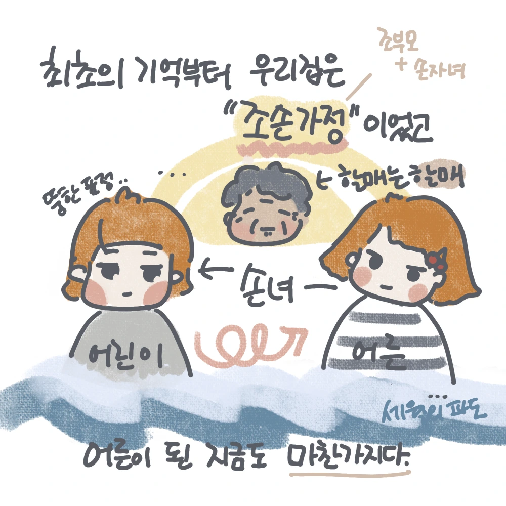 내 최초의 기억부터 우리집은 조손가정이었고, 지금도 마찬가지이다. 조손가정이란 부모의 이혼, 부재 등 여러 가지 사정으로 조부모와 손자녀가 함께 사는 가정을 의미한다. 전에는 조손가정을 포괄하는 용어로, 결손가정이라 불리기도 했고, 경제적 여건에 따라 때때로 차상위 계층, 기초생활수급자(과거 영세민) 등 사회 취약 계층이 되기도 한다. 초등학교 가정조사 때, 가정의 형태를 묻는 설문지, 즉 누구와 함께 사는지를 묻는 그 문답을 통해 우리집이 조손가정이라는 것을 알게 되었다.