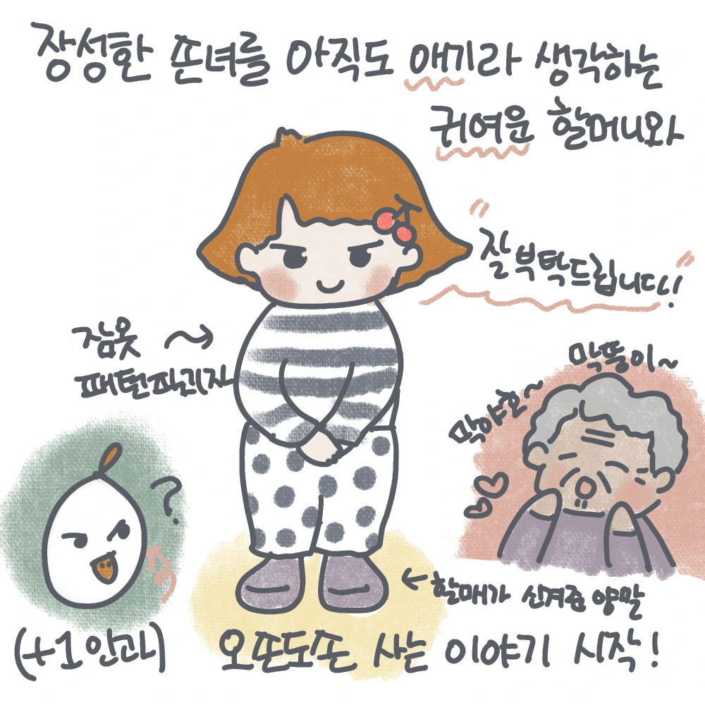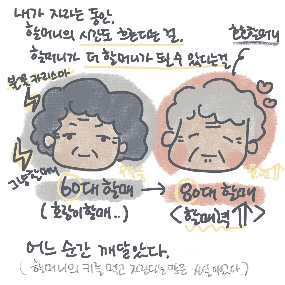 나는 (감사히도) 지금도 할머니와 함께 산다. 커서도 조손가정이다. <나의 아저씨>, <그해 우리는> 같이 조손가정이 등장하는 드라마가 나올 때면, 내심 반갑기도 하다. 그러면서 내안에 잠재되어 있던 욕망이 슬금슬금 고개를 내밀었다. 조손가정으로서 겪었던 경험과 감정에 대해 돌아보고 기록으로 남기고 싶다는 것. 그리고 어느 새 내가 자란 시간 만큼 빠르게 흘러 간 할머니의 시간도 기록을 통해 조금씩 늦추고 싶다는 것.