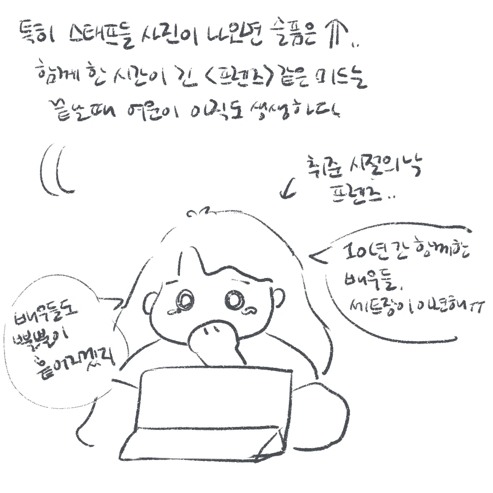 시즌이 긴 미국드라마 같은 경우, 배우들의 성장과 노화가 시즌마다 느껴지는데, 처음엔 나보다 어렸었던 등장인물이 어느새 나보다 더 나이가 들어버리면, 슬퍼진다. 시즌이 길면, 보다가 지쳐 나중에는 우정으로 보기도 하지만, 마지막화는 내용이 아무리 유쾌하고 따뜻하더라도, 슬퍼진다. 특히 프렌즈 마지막 화를 볼 때는 마음속으로 오열했다. 취업 준비생의 새벽 감성 한 스푼을 더한, 슬픈 이별이었다.