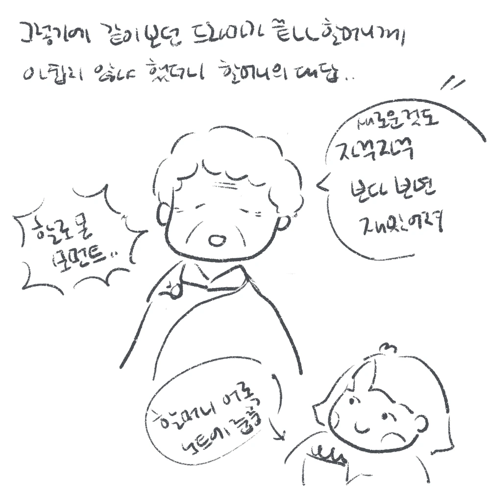 할머니도 혼자 보는 것보단 나랑 봐야 재밌어하신다. 닭은 스마트폰을 주로 하며, 드라마를 건성으로 보기 때문에 할머니도 내가 집에 없는 날엔 드라마를 같이 볼 사람이 없어 아쉬워하시기도 한다. 할머니랑 나는 드라마 친구인 셈이다. 드라마 내용도 중요하지만, 드라마의 재미는 역시 이렇게 함께 주거니 받거니 하는 현실 세계의 논평에 있는 것 같기도 하고. 참고로, 회관에서 악역으로 주로 등장하는 배우가 나오면 할머니들끼리 비속어가 난무하고 난리라고 한다, 그런 이야기 듣는 것도 재밌다.