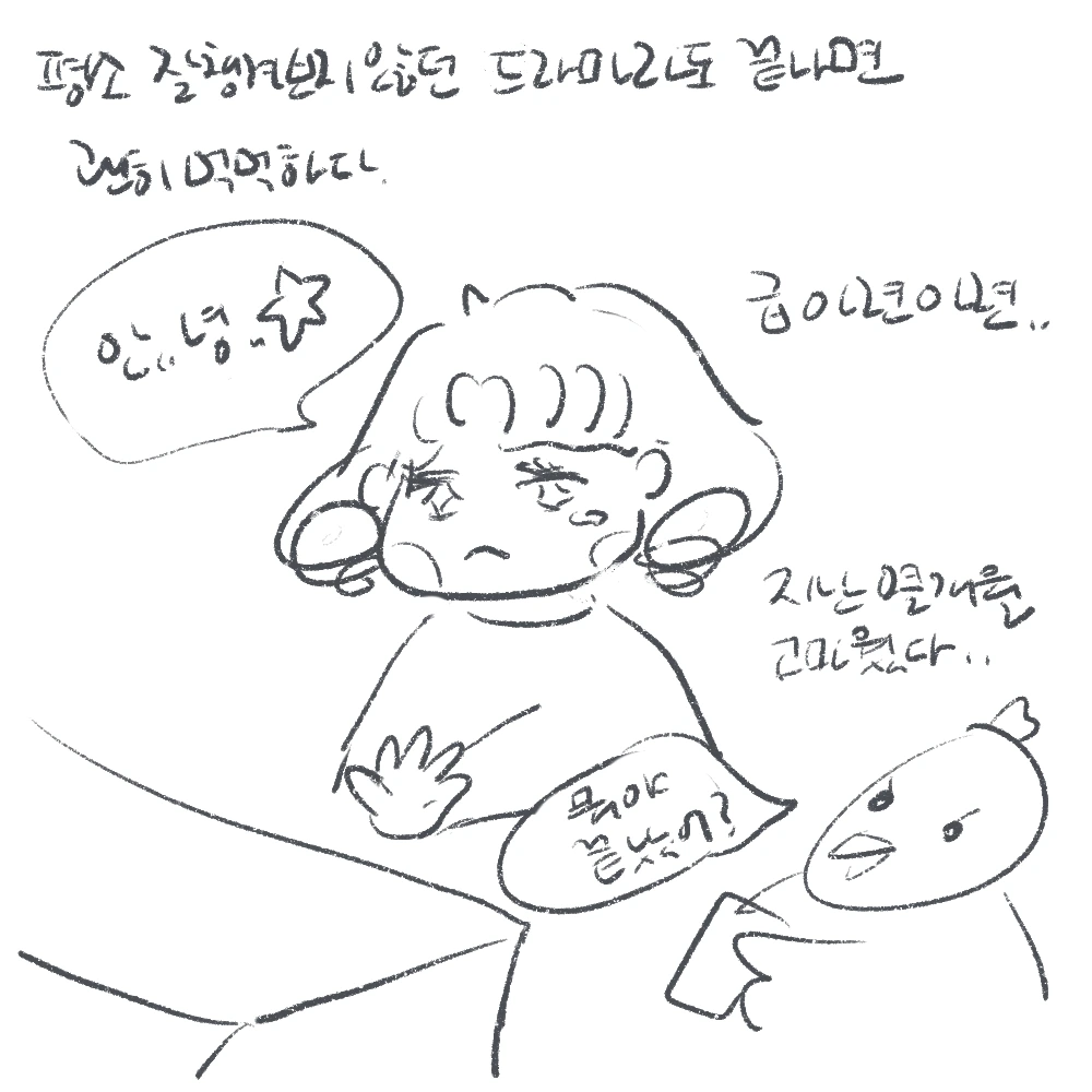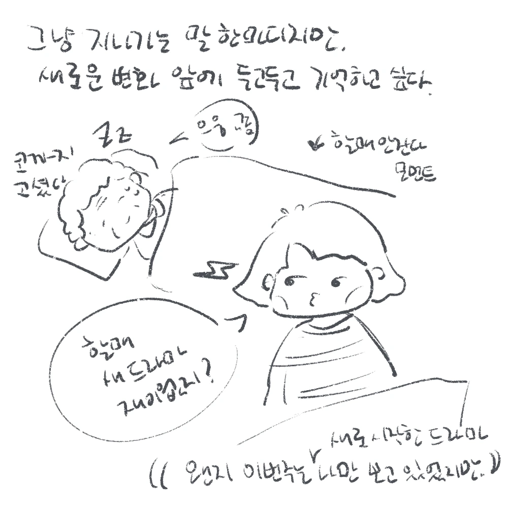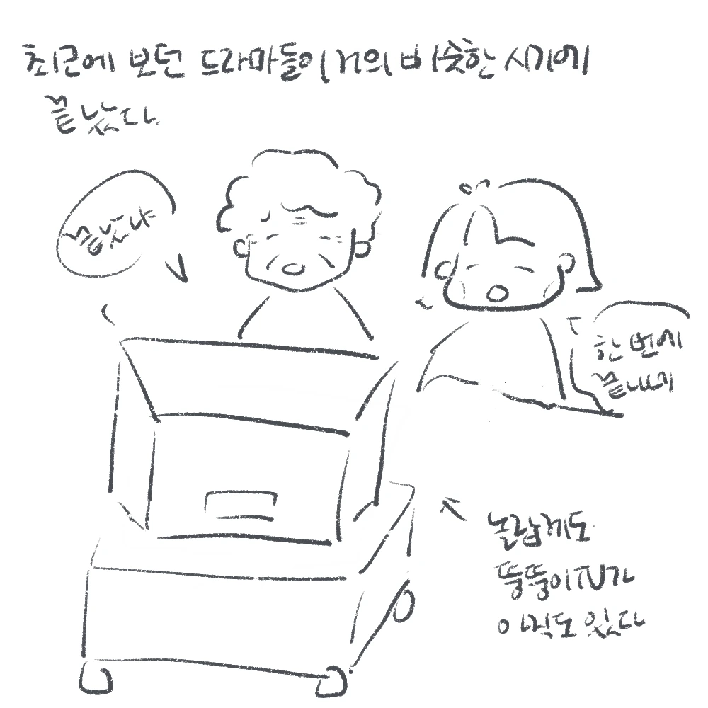 끝을 아쉬워하고 새로운 것에 쉽게 마음을 주지 못하는 나로서는, 어떤 변화든 설렘보다 두려움이 컸었다. 시골에서 서울로 가는 대학생활, 몇 친구들을 부러워하고, 대학 가서 만난 친구들도 서울생활, 대학생활로 신나 보였지만, 나는 신입생 시절, 지금 이맘때를 생각하면 가라앉았던 나의 마음이, 마음을 붙이지 못하도 티는 못 내도 혼자 떠다녔던 마음이 떠오른다. 그렇기에 이런 변화의 시기가 나로서는 할머니의 말을 두고두고 기억하고 싶다. 드라마가 끝나면 늘 아쉬움이 조금씩 남기 마련이지만, 이번엔 할머니와 함께니까 새로운 드라마 세계로 함께 스며들 것이라 믿는다. 할머니 말대로, 뭐든 자꾸 보다 보면 재밌어지니까. 그런데, 할머니, 새로운 드라마 보다 주무신다. “할매! 드라마 재미없지?”, “으응. (쿨쿨)”