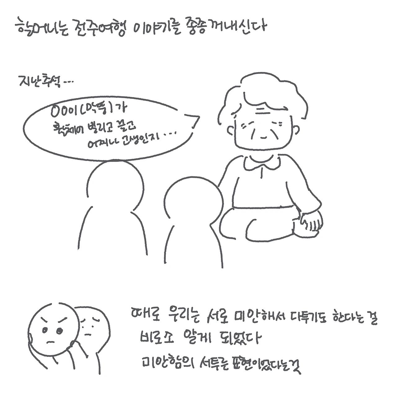 첫 번째 여행 추억은 2년이 지난 지금도 매우 강렬하게 기억 남는다. 사실 가이드의 역할을 맡은 자로서 마음 놓고 즐길 수는 없었지만, 돌이켜 보면, 정말 잘 다녀왔고, 감사했다는 생각이 든다. 여행은 그 순간으로 끝나는 게 아니라 추억 여행으로 비로소 완성되는 것 같다. 다만 마음에 걸리는 것은 할머니께서 그 여행을 미안함과 함께 기억하고 있다는 것. 할머니는 아직도 종종 사람들에게 이런 이야기를 꺼내신다. 함께 여행하면 애들이 고생이라고, 휠체어를 끌고 반납하느라 막뚱이가 너무 고생이 많았다고. 휠체어를 가져오고 반납하고, 그 과정이 내내 마음에 걸리셨나 보다. 그리고 깨달았다. 서로 옥신각신했던 건 서로 미안해서였다는 걸. 미안함의 서투른 표현이었다는 걸을 이제는 알 것 같다. 그래도 이런 우여곡절의 완벽하지 않은 첫 여행이 있었기에, 다음 여행은 채울 건 채우고, 비울 건 비워가며 계속 지속할 수 있었던 게 아닐까. 모험과도 같았던 첫 여행은 우리도 여행을 갈 수 있다는 것을 깨달았다는 것, 여행의 물꼬였다는 점만으로도 의미가 있었다.