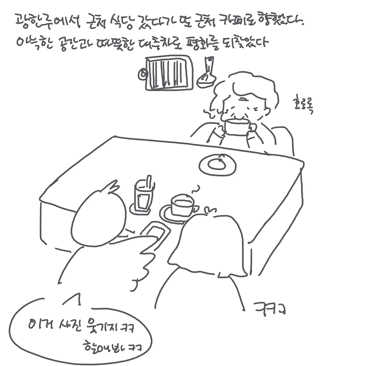 결국 광한루는 포기하고, 돼지 갈빗집에서 저녁을 먹고, 근처 카페에 갔다. 비가 계속 내려서 뜨겁기까지 했던 가을날이 급랭했지만, 옛날 초가집 같은 아늑한 카페에서 따뜻한 대추차를 마시며 몸을 녹이고, 마음도 녹였다. 그리고 깨달았다. 할머니와의 여행에서 필요한 것은 이런 여유였다는 것을. 모든 걸 내 욕심대로 할 수는 없다는 것을, 내가 좋다고 생각한다고 하더라도 그게 답은 아닐 수 있다는 것을. 여행에서는 늘 변수가 발생하고, 변수가 때로는 내 자신이 되기도 한다. 기분은 소용돌이와 같이서 한번 떨어지기 시작하면 계속 나선을 따라 끝없이 지하로 낙하하는데, 잠깐 의식적으로라도 멈출 필요가 있다는 것을.