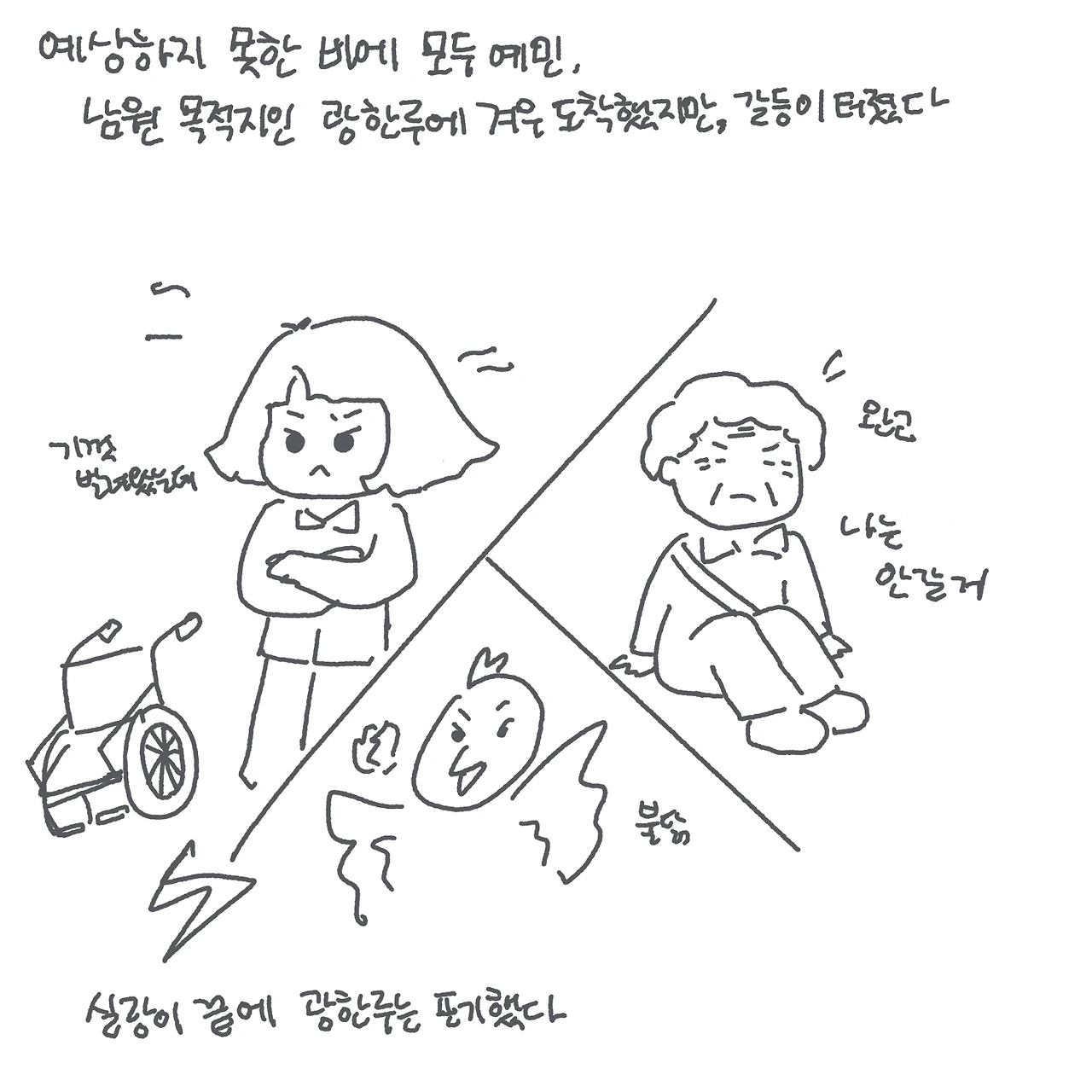 남원은 춘향이의 고장. 하지만, 남원에 내리자마자 비가 콸콸 쏟아지기 시작했고, 닭과 나는 별 거 아닌 이유로 다퉜고, 먹구름과 추적추적한 비처럼 분위기는 엉망진창. 남원 경유의 목적지였던 광한루에 어찌어찌 들어가 휠체어도 대여했지만, 할머니는 가지 않겠다고 고집하셔서 포기했다. 여행하면서 조금씩 쌓인 스트레스가 폭발하던, 뭔가 글로 남기기 부끄럽고 껄끄러운 순간이었지만, 사실 그때는 처음 여행지에서의 호의를 깊게 느꼈던 순간이기도 하다. 전주에서도 다들 대체로 친절하셨지만, 온갖 부정적인 감정으로 차올랐을 때 받은 친절은 더 따뜻하게 느껴졌기 때문이다. 정확히는 기억나지 않지만 어떤 직원분께서 어떤 도움을 주셨고, 무엇보다 할머니에게 매우 다정하게 대해주셔서 얼어붙은 마음이 녹는 기분이었다. 기껏 여행 잘 마치고, 돌아가기 직전 각자의 이유로 살얼음판이었던 우리 가족에게 따뜻함을 나눠주셨다.