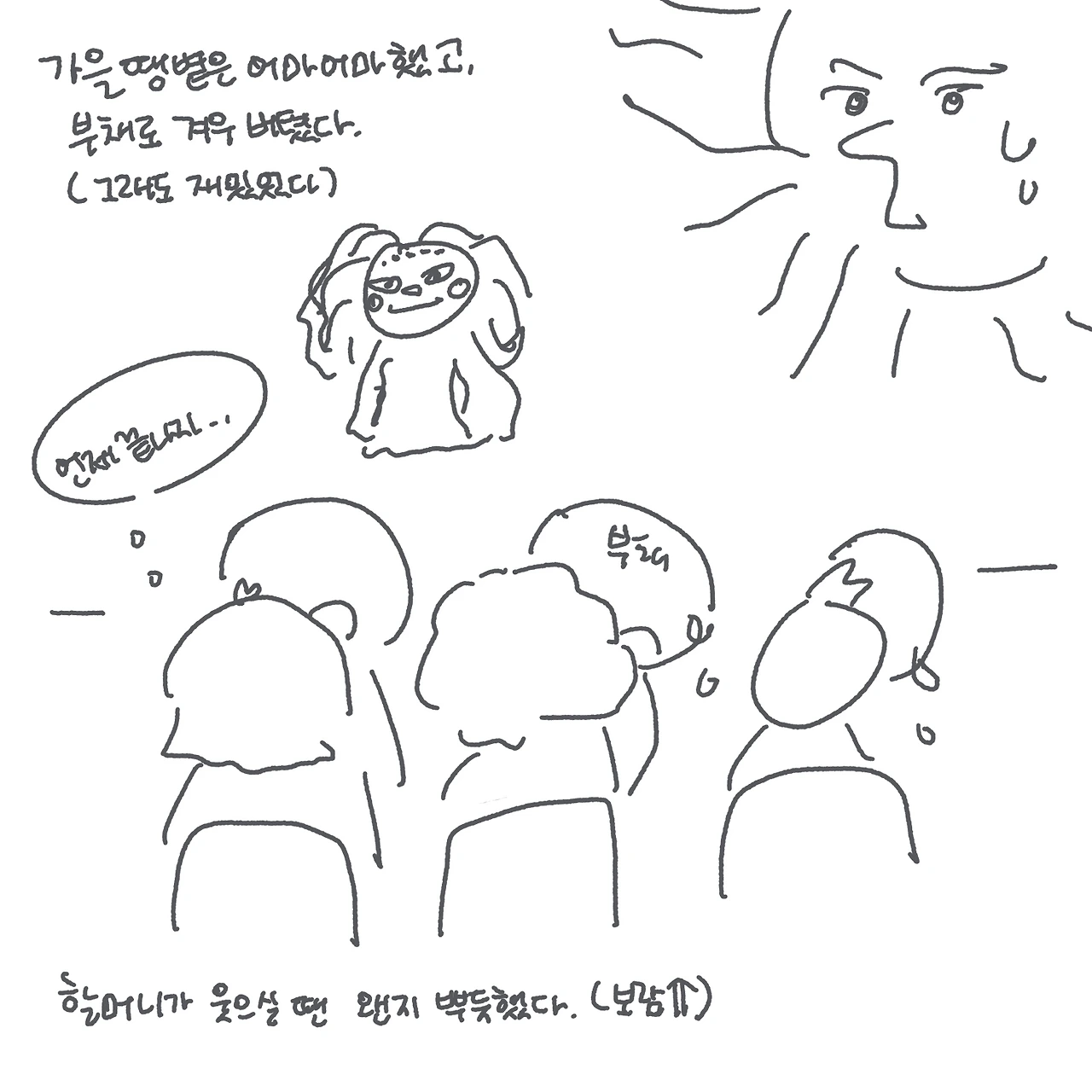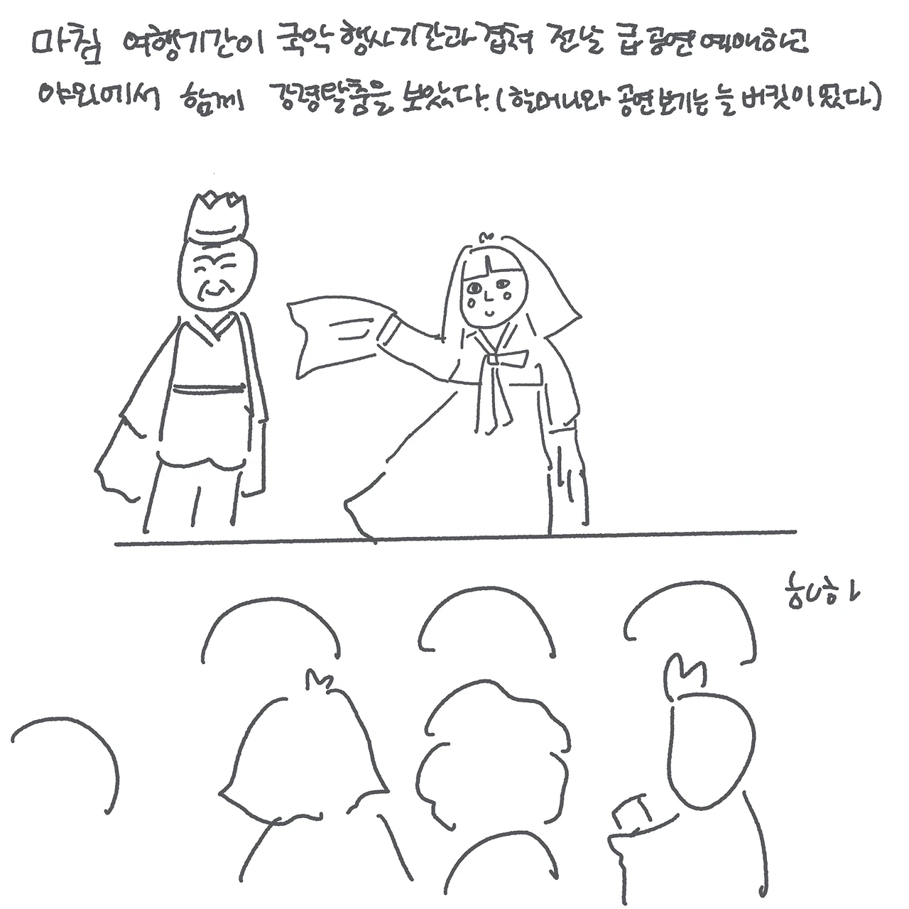 둘째 날도 한옥 마을로 향했고, 이제는 조금 더 당당하게 휠체어를 빌렸고, 유명한 맛집으로 소문난 곳에서 칼국수를 먹고, 전날 우연히 알게 되어 예매해 둔 국악 공연을 보러 공연장으로 향했다. 전주가 부러워졌던 순간 중 하나였다. 전주는 양반 도시일 뿐만 아니라 국악의 도시기도 했다. 나는 사실 국악을 좋아하는 편이다. 어린 시절, 할아버지나 작은할아버지께서 Tv로 판소리 같은 전통 공연을 보시는 걸 (뉴스를 재밌어하신다는 사실과 더불어) 이해 못 했던 내가 대학에 들어가 국악동아리에서 활동하고, 국악 수업도 듣고, 종묘제례악을 보러 가기도 하고, 국립국악원에서 공연 보고, 민요도 부르고, 부채춤도 추기도 했다. (나열하니 거창해 보이지만 실상은 매우 짧은 이벤트들이었다…) 할머니는 공연장에서 공연을 볼 일이 거의 없으셨기 때문에, 트로트 가수 티켓팅 관련 뉴스들을 볼 때면 할머니도 으레 생각났었는데, 가는 날이 장날이라고 전주 여행하던 시기가 마침 국악 관련 행사 주간이었다. 이건 기회라고 생각하고 미끼를 덥석 물었다. 10월이라고 믿기지 않을 정도로 내리쬐는 뙤약볕에 익어가면서 본 공연, 닭은 매우 지루해했지만, 할머니는 탈춤을 즐겼다. 태양이 뜨거운 것만 빼면 앉아서 볼 수 있었고, 웃음 포인트들이 있었다. 공연을 보고, 다시 기차 타고 남원에 들렀다.