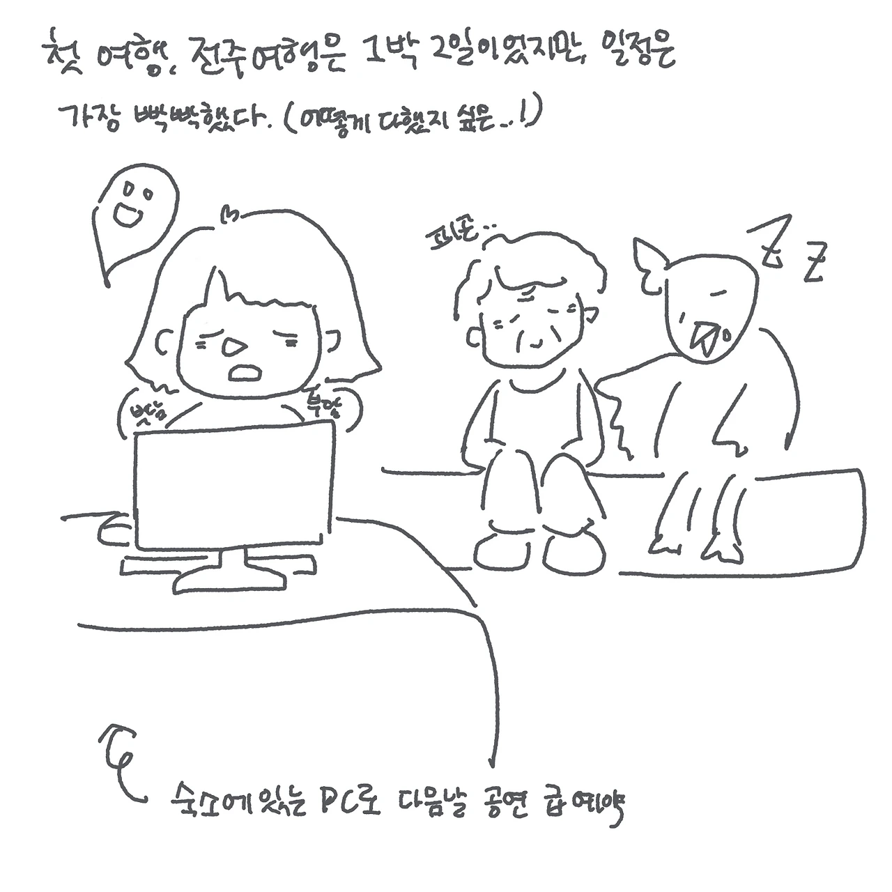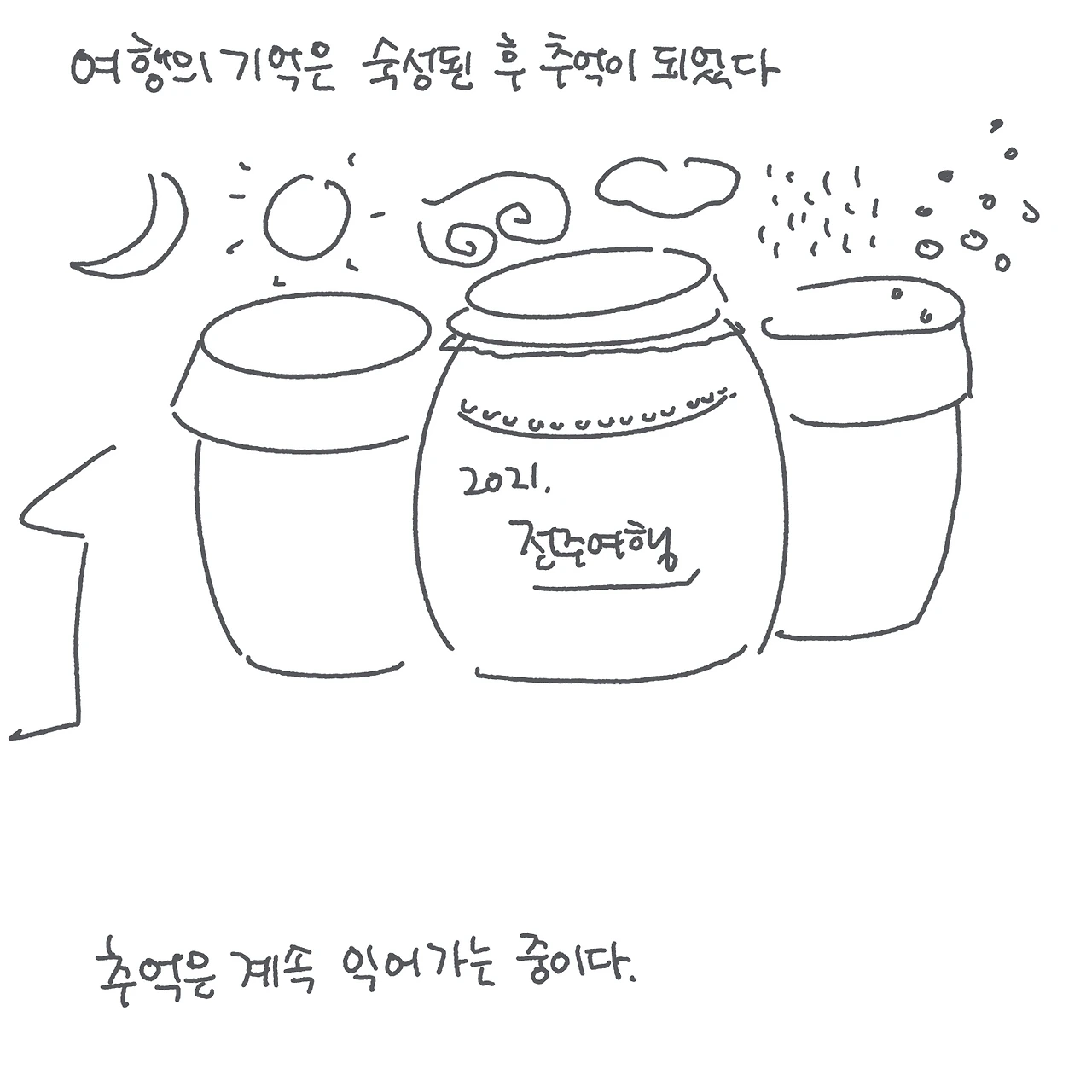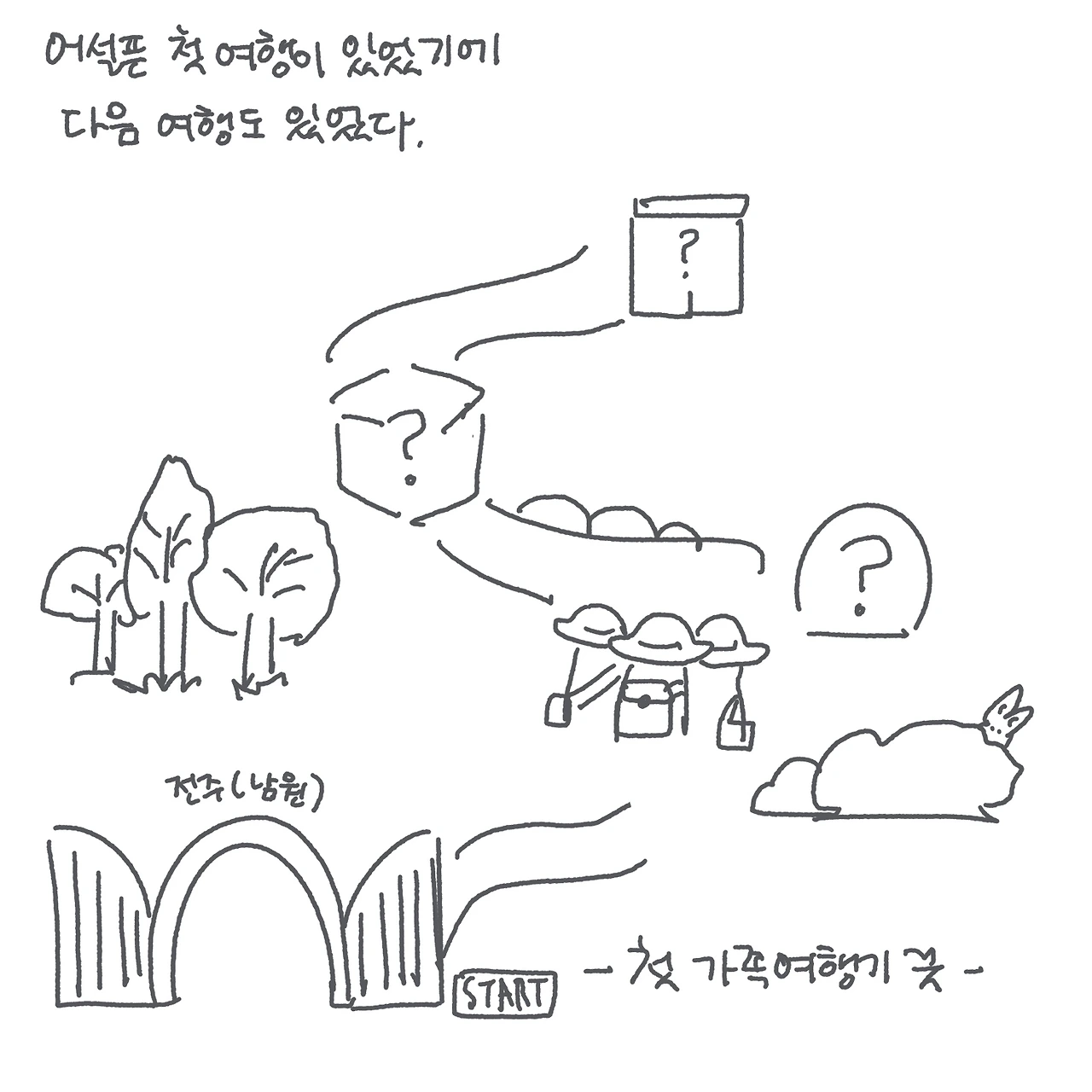 전주 여행은 1박 2일이었다. 하지만 야심 찬 첫 가족여행이니만큼 최근 갔던 2박 3일 여수 일정보다도 오히려 더 많은 걸 하고 왔다. 많은 걸 해보겠다는 욕심에서 가끔 삐그덕 대는 불협화음이 발생하기도 했지만, 처음은 늘 그런 것 같다. 완벽한 처음은 어렵다. 처음의 경험을 바탕으로 조금씩 맞는 걸 찾고, 그때그때 맞춰오는 과정이 필요하다. 그러므로 처음을 망쳤다고 생각해서 우울해할 필요는 없는 것 같다. 그 경험도 다음 경험을 위한 받침이 될 뿐만 아니라 엉성하면 엉성한 대로 기억 남는다. 우리에겐 추억보정과 망각이라는 인류의 축복이 있다. 완벽하진 않더라도 함께 맛있는 걸 먹고 좋은 걸 보고, 그런 순간의 장면들이 삶을 더 빛나게 해 준다.