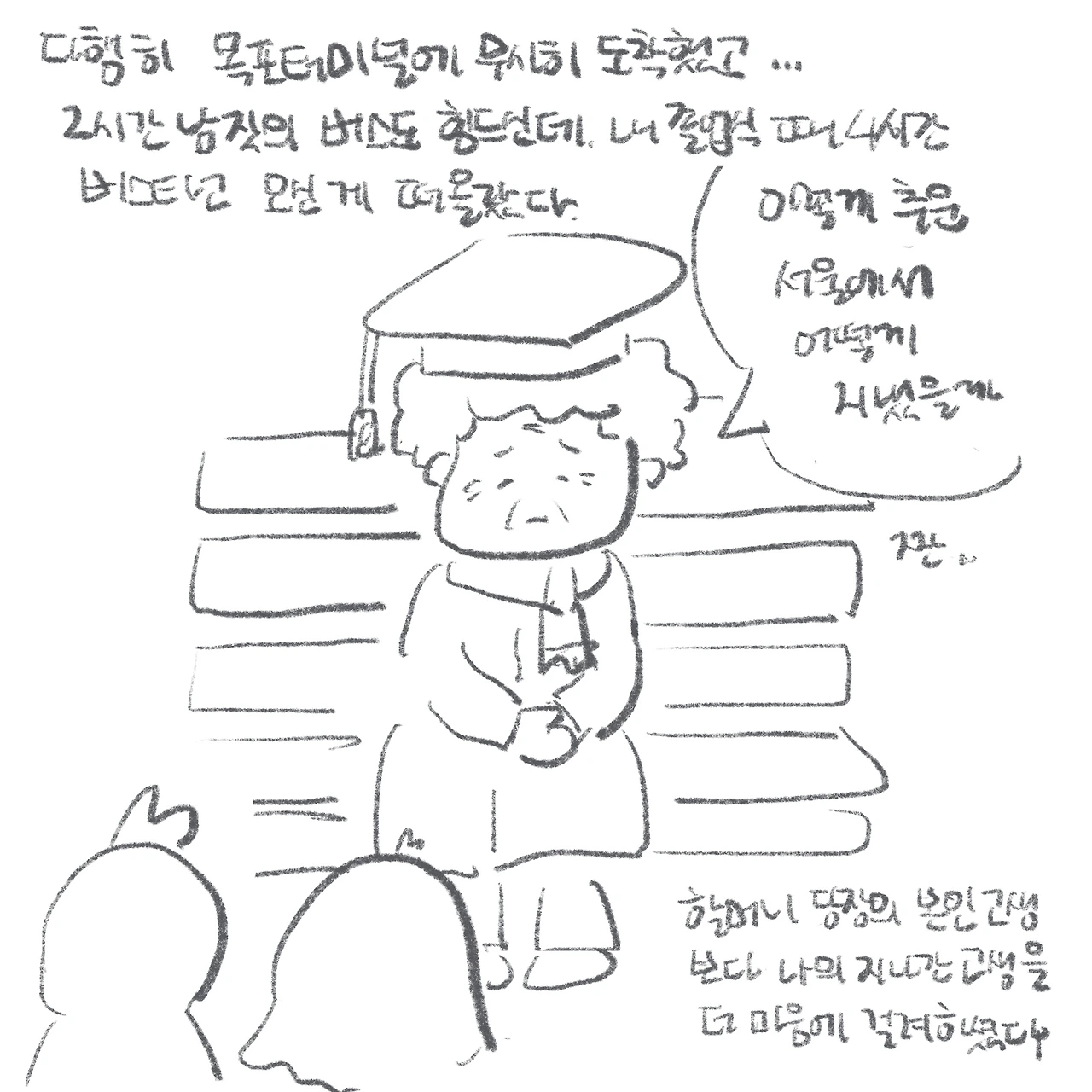 위기가 지나가면 성찰과 교훈의 시간이 찾아온다. 이를 계기로 깨달았다. 할머니와 여행은 화장실도 꼭 고려해야 한다는 것을. 우리 할머니뿐만 아니라 동네 할머니 모두 비슷한 고충을 겪고 계신다고 한다. 게다가 할머니는 화장실뿐만 아니라 버스에 오래 앉아계시는 걸 못 견뎌하시는데, 4시간 가까이 버스를 타시며 내 대학 졸업식에 오셨는지 신기할 따름이었다. 할머니가 왜 그때의 서울행을 얘기하며 스스로를 오져하시는지 피부에 와닿았다. 나는 그때 버스를 따로 타서 몰랐었다. 그리고 할머니는 졸업식에서 당신의 고된 서울행보다는 이렇게 추운 곳에서 어떻게 막뚱이 혼자 지냈냐는 이야기만 몇 번이고 말씀하셨었다.