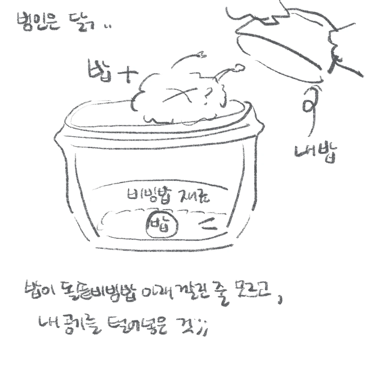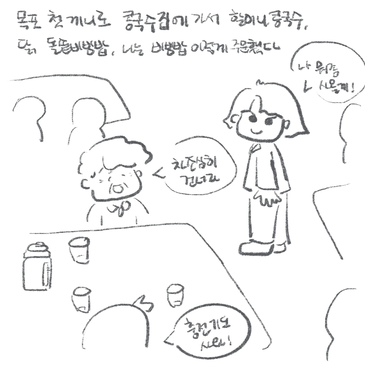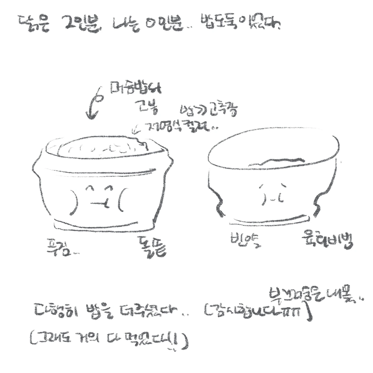 밥이 따로 나오는 돌솥비빔밥이라니, 생각해 보면 말이 안 되는 상황이었다. 황당 그 자체였다. 덕분에 닭의 돌솥비빔밥은 희멀건한 저염식 아우라를 풍기게 되었고, 나는 대신 부끄러워졌다. 그래도 다행히 친절하신 아주머니 덕에 고추장을 더 섞어 맛 밸런스를 맞추고, 할머니와 비빔밥을 나눠먹음으로써 이 사건은 해피엔딩으로 마무리되었다. (나는 진실이 밝혀진 후, 닭이 ‘헤헿, 몰랐다!’며 지었던 맑눈광 웃음이 가아끔 떠오른다.)