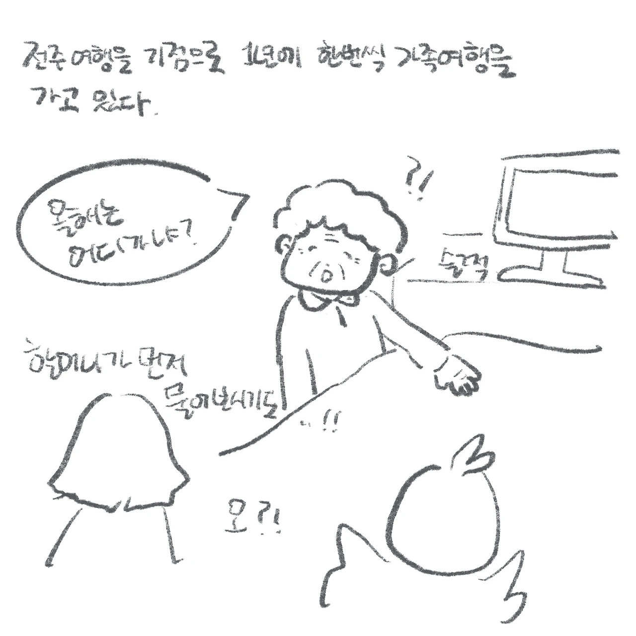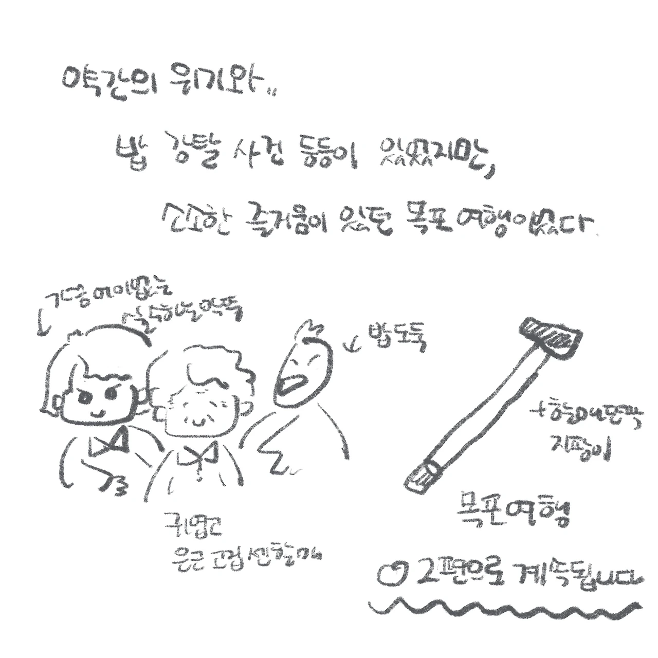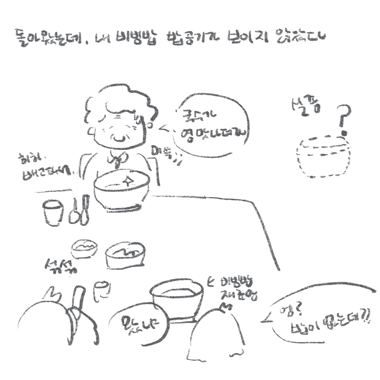 밥이 따로 나오는 돌솥비빔밥이라니, 생각해 보면 말이 안 되는 상황이었다. 황당 그 자체였다. 덕분에 닭의 돌솥비빔밥은 희멀건한 저염식 아우라를 풍기게 되었고, 나는 대신 부끄러워졌다. 그래도 다행히 친절하신 아주머니 덕에 고추장을 더 섞어 맛 밸런스를 맞추고, 할머니와 비빔밥을 나눠먹음으로써 이 사건은 해피엔딩으로 마무리되었다. (나는 진실이 밝혀진 후, 닭이 ‘헤헿, 몰랐다!’며 지었던 맑눈광 웃음이 가아끔 떠오른다.)