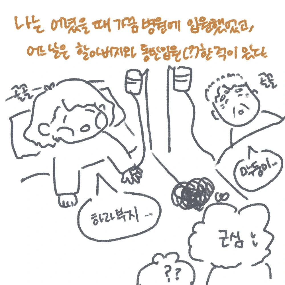 아무튼 그렇게 할아버지와 나는 병실에, 할머니와 언니는 왔다 갔다 하면서 병실에서 시간이 흐르고, 이윽고 원숭이 오빠가 먼저 퇴원을 하게 되었다. 원숭이 오빠네 부모님도 친절하신 분들이었고, 할아버지 할머니와 두런두런 이야기를 나누셨다. 아이들은 은근히 귀가 밝고 눈치가 빠르다. 못 들은 척 못 알아들은 척할 뿐. 눈치 빠른 어린이였던 나는 갑자기 분위기가 심상치 않음을 감지하게 되었다.
