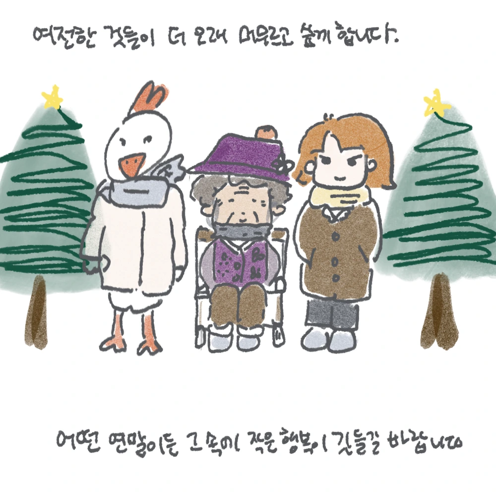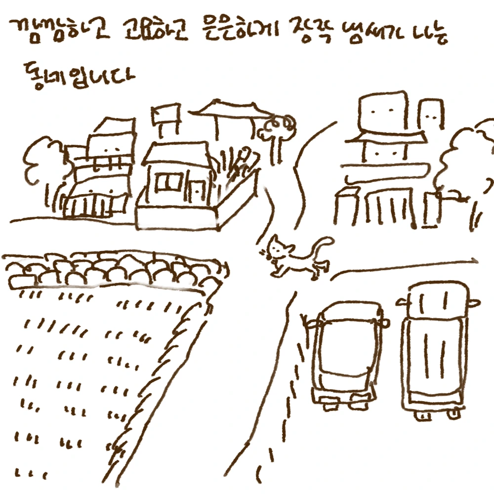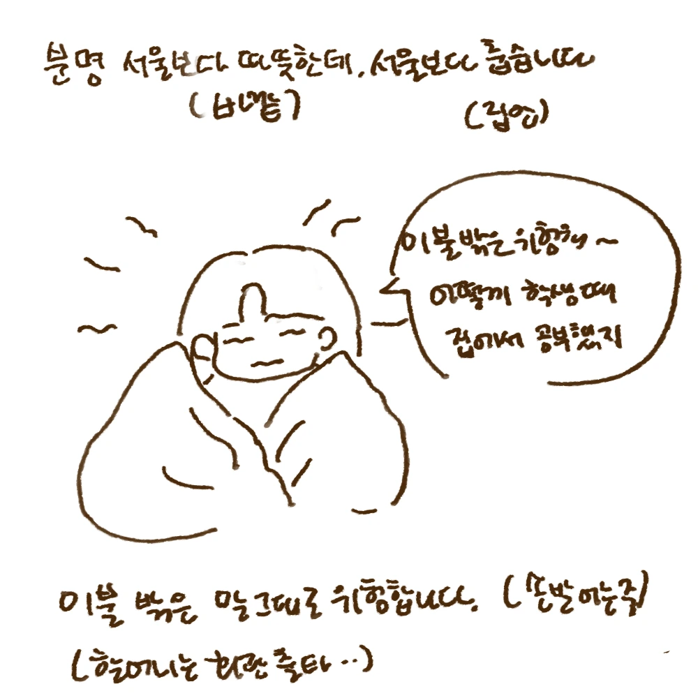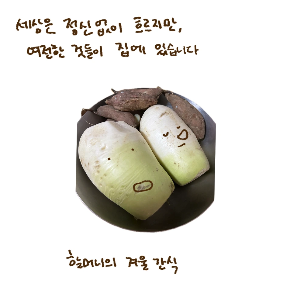 아무튼 최근엔 자의로 집을 떠나 살게 되었고, 오랜만에 집에 내려와 키보드를 두드리고 있습니다. 집은 감사히도 여전합니다. 무시(무)와 고구매(고구마)는 여전히 겨울 방 한 구석을 차지하고 있습니다. 아주 약간의 변화들은 있었지만, 야밤에 오토바이 소리나 얼굴 모를 이웃의 코 고는 소리가 안 들리는 고요함 속에서 집에 왔음을 실감하곤 합니다. 집은 여전히 춥지만, 다 큰 손녀 막뚱이라고 이불 단속을 하시는 할머니의 손길을 느끼며 편안하게 잠들고 있습니다. (역시 집이 최고!!)