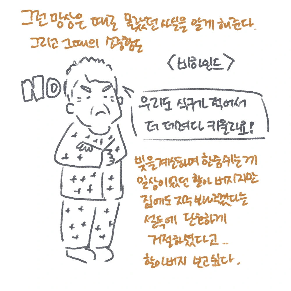 후에 할아버지가 돌아가신 후, 어느 날 문득 그 일이 생각나 할머니께 그때 일을 여쭤봤다. 할머니도 물론 기억하고 계셨고, 내가 기억하지 못하는 조각을 이어 붙여주셨다. 할아버지는 처음에는 장난으로 여기다, 진심이란 걸 알게 되신 후, “우리도 식구가 적어서 더 데려다 키울라요.”하고 완강하게 거절 의사를 표했다는 것. 진심이었던 원숭이 오빠네와 우리 할아버지. 그렇게 해서 나는 이 집에 남고, 이렇게 조손일기도 쓰게 된 것이다.