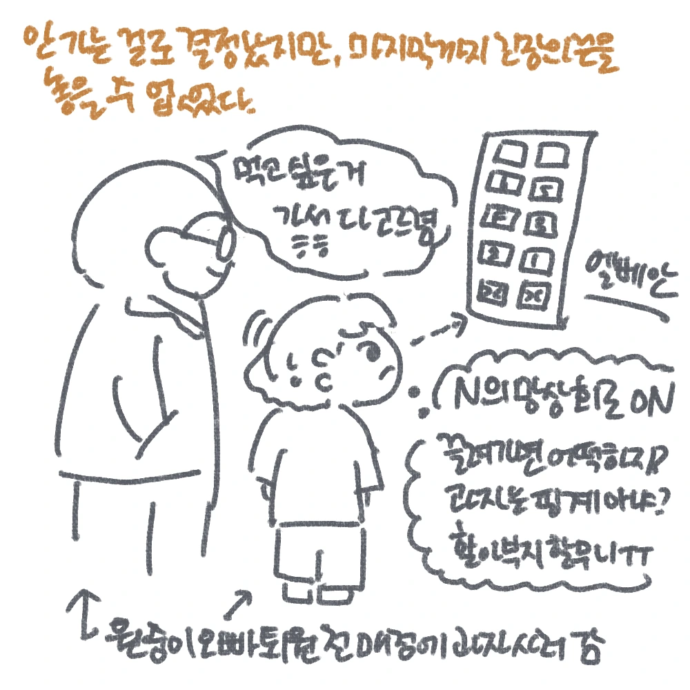 원숭이 오빠의 아버지께선 작별 선물이라며, 과자를 마음껏 고르라며 나를 병원 1층 매점으로 데려가셨다. 내려가는 엘리베이터 안에서 사실 입양이 결정되었고, 과자를 핑계로 끌려가는 건 아닌지, 이대로 가족들과 영영 헤어지게 되는 건 아닌지, 온갖 상상을 하며, 온 신경이 곤두섰다. 과자를 한 아름 안고 다시 병실로 돌아올 때까지 긴장의 끈을 놓을 수 없었다.