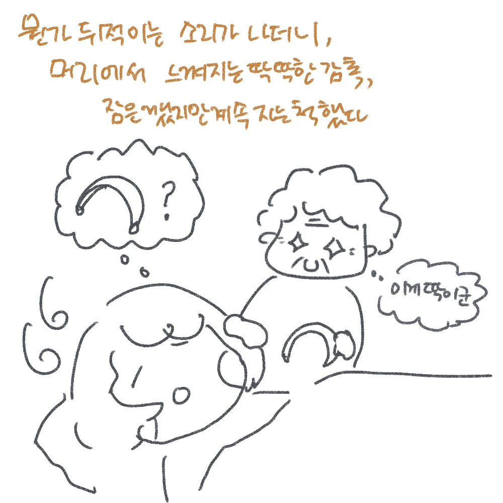 이윽고 뭔가 뒤적뒤적 뽀시락 뽀시락 거리는 소리가 나더니 나갔을 때와 동일한 진동을 울리며 퉁퉁 할머니가 돌아왔다. 그리고 내 이마에 느껴지는 딱딱하고, 익숙한 감촉. 눈을 감은 채 상황을 파악하고 있던 나는 굳이 눈을 뜨지 않아도, 날리는 머리에 불편해하는 나를 발견하고 할머니가 이곳저곳 뒤적거려 찾아낸 머리띠를 내 머리에 씌워주려고 이리저리 애를 쓰고 있다는 것을 짐작할 수 있었다. 안경도 그렇고 머리띠도 그렇고 타인이 해주기 어려운 두 가지 아니던가. 괜히 할머니의 열심을 방해하고 싶지 않아서, 그리고 뭔가 챙김을 받는 기분을 간직하고 싶어서 잠은 대충 깼으면서 계속 자는 척을 했다. 가끔은 그렇게 이미 잠에 깼으면서 계속 자는 척하고 싶을 때가 있다.