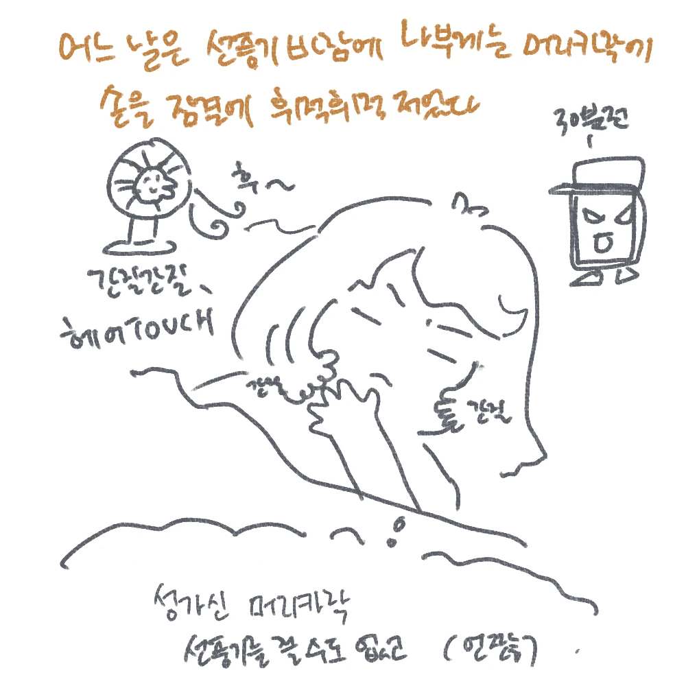 어느 날은, 선풍기 바람에 나부끼는 내 머리카락이 얼굴을 간지럽혀 잠결에 손을 휘적휘적 휘저었다.